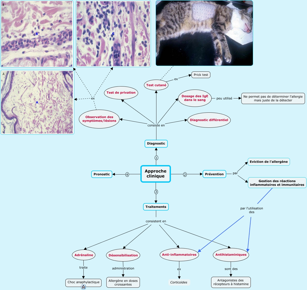 Cette carte de concepts créée avec IHMC CmapTools traite de: 5.0.Approche clinique, Traitements consistent en Adrénaline, Approche clinique 3 Traitements, Diagnostic consiste en Diagnostic différentiel, Diagnostic consiste en Test de privation, Traitements consistent en Désensibilisation, Observation des symptômes/lésions ex B, Gestion des réactions inflammatoires et immunitaires par l'utilisation des Anti-inflammatoires, Désensibilisation administration Allergène en doses croissantes, Adrénaline traite Choc anaphylactique, Test cutané ex Prick test, Dosage des IgE dans le sang peu utilisé Ne permet pas de déterminer l'allergie mais juste de la détecter, Approche clinique 4 Pronostic, Anti-inflammatoires ex Corticoïdes, Gestion des réactions inflammatoires et immunitaires par l'utilisation des Antihistaminiques, Observation des symptômes/lésions ex A, Diagnostic consiste en Test cutané, Diagnostic consiste en Dosage des IgE dans le sang, Prévention par Eviction de l'allergène, Traitements consistent en Anti-inflammatoires, Prévention par Gestion des réactions inflammatoires et immunitaires