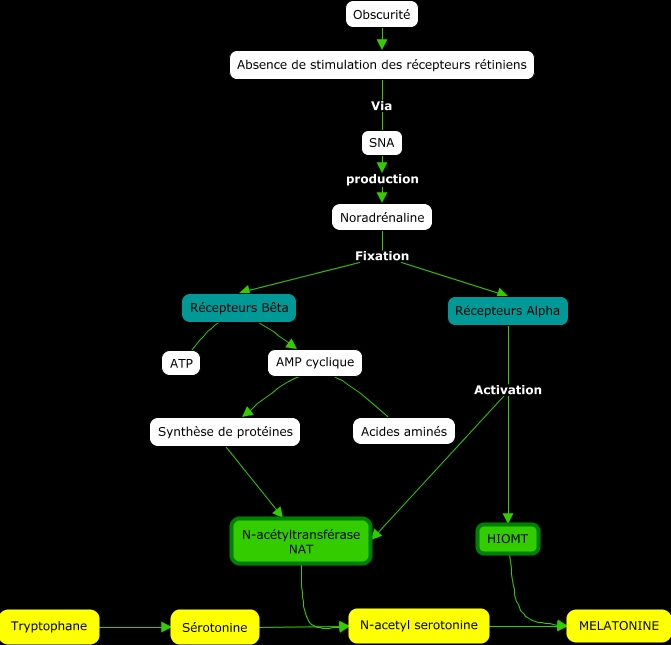 Cette carte de concepts créée avec IHMC CmapTools traite de: Synthèse de la mélatonine, Noradrénaline Fixation Récepteurs Alpha, Tryptophane Sérotonine, N-acétyltransférase NAT N-acetyl serotonine, HIOMT MELATONINE, SNA production Noradrénaline, Synthèse de protéines N-acétyltransférase NAT, Sérotonine N-acetyl serotonine, N-acetyl serotonine MELATONINE, Acides aminés Synthèse de protéines, Noradrénaline Fixation Récepteurs Bêta, ATP AMP cyclique, Récepteurs Alpha Activation N-acétyltransférase NAT, Récepteurs Alpha Activation HIOMT, Absence de stimulation des récepteurs rétiniens Via SNA, Obscurité Absence de stimulation des récepteurs rétiniens