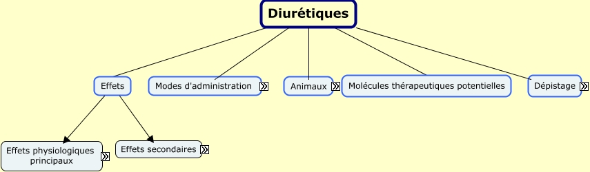 Cette carte de concepts créée avec IHMC CmapTools traite de: Diurétiques, Effets secondaires Système cardiovasculaire, Diurétiques Molécules thérapeutiques potentielles, Utilisation thérapeutique pour Hypertension artérielle, L'équilibre hydro-électrique Quoi? Potassium, Cacher la prises de substances dopantes interdites Comment? En empêchant l'excrétion passive de molécules médicamenteuses/dopantes dans l'urine, L'équilibre hydro-électrique Conséquences Extraction massive d'eau, Spectrométrie de masse Combinaison des deux, Echantillon urinaire Particularité Courte durée de vie, Dépistage Echantillon urinaire, Effets physiologiques principaux Chez les humains Utilisation thérapeutique, Diurétiques Animaux, Cacher la prises de substances dopantes interdites Comment? En diluant l'urine, Echantillon urinaire Via High performance liquid chromatography, Diurétiques Modes d'administration, Cacher la prises de substances dopantes interdites Comment? En altérant le pH urinaire, High performance liquid chromatography Combinaison des deux, Effets physiologiques principaux, Effets physiologiques principaux agit sur Les reins, Extraction massive d'eau Donc Dilution de l'urine, Augmentation du risque de thromboses Cause Epaississement du sang