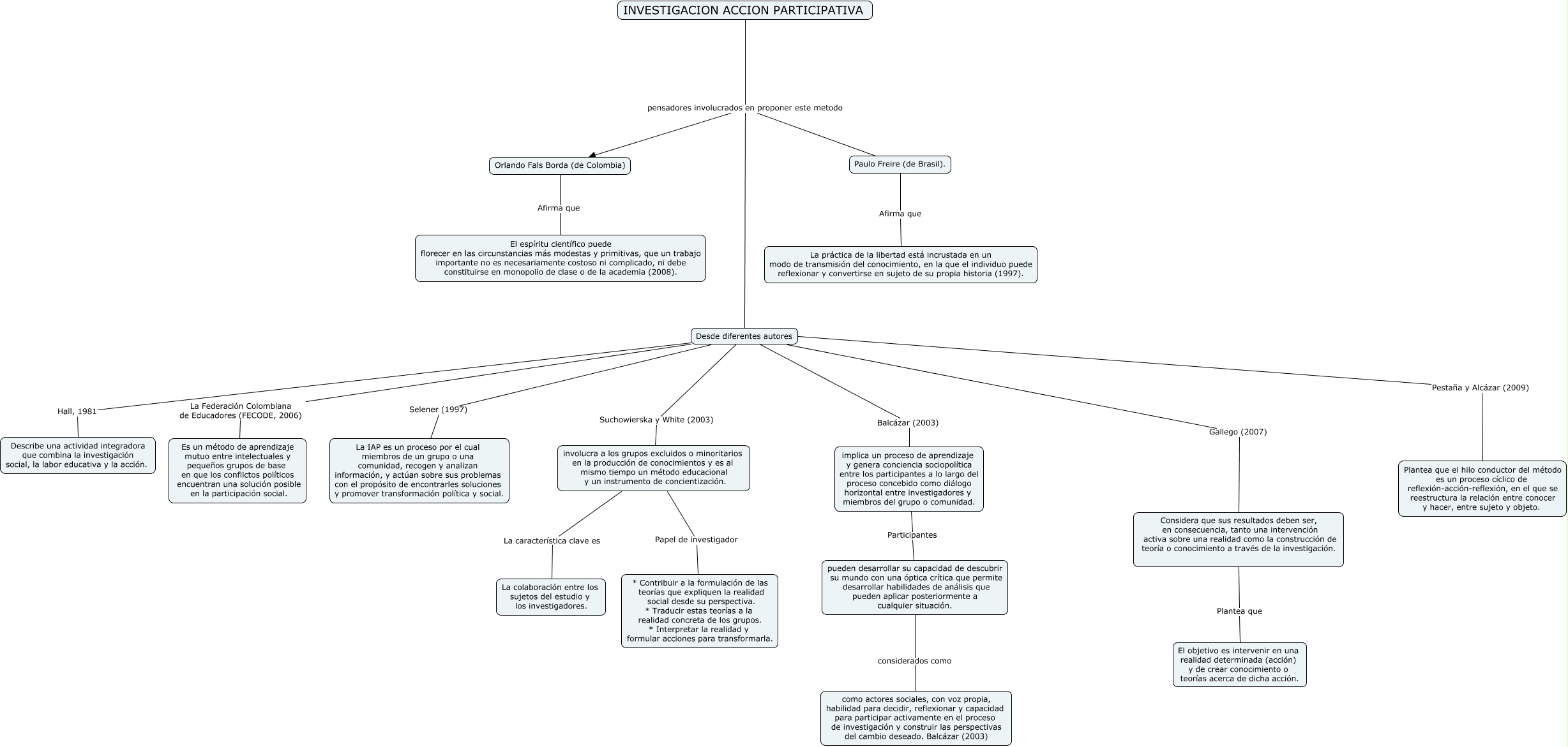 Este Cmap, tiene información relacionada con: IAP MAPA, Desde diferentes autores Balcázar (2003) implica un proceso de aprendizaje y genera conciencia sociopolítica entre los participantes a lo largo del proceso concebido como diálogo horizontal entre investigadores y miembros del grupo o comunidad., Considera que sus resultados deben ser, en consecuencia, tanto una intervención activa sobre una realidad como la construcción de teoría o conocimiento a través de la investigación. Plantea que El objetivo es intervenir en una realidad determinada (acción) y de crear conocimiento o teorías acerca de dicha acción., Desde diferentes autores La Federación Colombiana de Educadores (FECODE, 2006) Es un método de aprendizaje mutuo entre intelectuales y pequeños grupos de base en que los conflictos políticos encuentran una solución posible en la participación social., Orlando Fals Borda (de Colombia) Afirma que El espíritu científico puede florecer en las circunstancias más modestas y primitivas, que un trabajo importante no es necesariamente costoso ni complicado, ni debe constituirse en monopolio de clase o de la academia (2008)., Desde diferentes autores Suchowierska y White (2003) involucra a los grupos excluidos o minoritarios en la producción de conocimientos y es al mismo tiempo un método educacional y un instrumento de concientización., involucra a los grupos excluidos o minoritarios en la producción de conocimientos y es al mismo tiempo un método educacional y un instrumento de concientización. Papel de investigador * Contribuir a la formulación de las teorías que expliquen la realidad social desde su perspectiva. * Traducir estas teorías a la realidad concreta de los grupos. * Interpretar la realidad y formular acciones para transformarla., implica un proceso de aprendizaje y genera conciencia sociopolítica entre los participantes a lo largo del proceso concebido como diálogo horizontal entre investigadores y miembros del grupo o comunidad. Participantes pueden desarrollar su capacidad de descubrir su mundo con una óptica crítica que permite desarrollar habilidades de análisis que pueden aplicar posteriormente a cualquier situación., Desde diferentes autores Hall, 1981 Describe una actividad integradora que combina la investigación social, la labor educativa y la acción., involucra a los grupos excluidos o minoritarios en la producción de conocimientos y es al mismo tiempo un método educacional y un instrumento de concientización. La característica clave es La colaboración entre los sujetos del estudio y los investigadores., INVESTIGACION ACCION PARTICIPATIVA pensadores involucrados en proponer este metodo Paulo Freire (de Brasil)., INVESTIGACION ACCION PARTICIPATIVA pensadores involucrados en proponer este metodo Orlando Fals Borda (de Colombia), INVESTIGACION ACCION PARTICIPATIVA pensadores involucrados en proponer este metodo Desde diferentes autores, pueden desarrollar su capacidad de descubrir su mundo con una óptica crítica que permite desarrollar habilidades de análisis que pueden aplicar posteriormente a cualquier situación. considerados como como actores sociales, con voz propia, habilidad para decidir, reflexionar y capacidad para participar activamente en el proceso de investigación y construir las perspectivas del cambio deseado. Balcázar (2003), Desde diferentes autores Gallego (2007) Considera que sus resultados deben ser, en consecuencia, tanto una intervención activa sobre una realidad como la construcción de teoría o conocimiento a través de la investigación., Paulo Freire (de Brasil). Afirma que La práctica de la libertad está incrustada en un modo de transmisión del conocimiento, en la que el individuo puede reflexionar y convertirse en sujeto de su propia historia (1997)., Desde diferentes autores Selener (1997) La IAP es un proceso por el cual miembros de un grupo o una comunidad, recogen y analizan información, y actúan sobre sus problemas con el propósito de encontrarles soluciones y promover transformación política y social., Desde diferentes autores Pestaña y Alcázar (2009) Plantea que el hilo conductor del método es un proceso cíclico de reflexión-acción-reflexión, en el que se reestructura la relación entre conocer y hacer, entre sujeto y objeto.