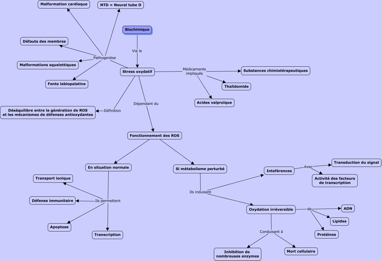 Cette carte de concepts créée avec IHMC CmapTools traite de: Biochimique, Stress oxydatif Pathogenèse Malformation cardiaque, Stress oxydatif Médicaments impliqués Substances chimiotérapeutiques, Stress oxydatif Médicaments impliqués Acides valproïque, Si métabolisme perturbé Ils induisent Inteférences, Oxydation irréversible de Lipides, Fonctionnement des ROS En situation normale, Si métabolisme perturbé Ils induisent Oxydation irréversible, Oxydation irréversible Conduisant à Inhibition de nombreuses enzymes, Biochimique Via le Stress oxydatif, Stress oxydatif Pathogenèse NTD = Neural tube D, Stress oxydatif Pathogenèse Malformations squelettiques, Oxydation irréversible de ADN, En situation normale Ils permettent Défense immunitaire, Stress oxydatif Médicaments impliqués Thalidomide, Oxydation irréversible de Protéines, Fonctionnement des ROS Si métabolisme perturbé, Stress oxydatif Pathogenèse Fente labiopalatine, Stress oxydatif Pathogenèse Défauts des membres, Stress oxydatif Dépendant du Fonctionnement des ROS, Inteférences Avec Activité des facteurs de transcription