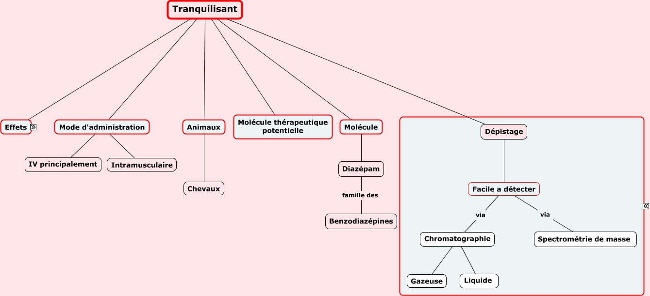 Cette carte de concepts créée avec IHMC CmapTools traite de: tranquilisant, Chromatographie Liquide, Tranquilisant Mode d'administration, Effets principaux diminution Du rythme cardiaque, Effets secondaires augmentation Du risque d'accidents, Chromatographie Gazeuse, Facile a détecter via Spectrométrie de masse, Du risque d'accidents dû à Une perte de vigilance, Effets Effets secondaires, Les récepteurs GABA Rôle? Inhibtion de l'influx nerveux dans le système nerveux central, Mode d'administration Intramusculaire, Effets secondaires long terme Dépression respiratoire, Mode d'administration IV principalement, Tranquilisant Effets, Effets secondaires long terme Atteinte du métabolisme, Effets principaux Myorelaxant, Effets Effets principaux, Effets principaux Anxiolytique, Dépistage Facile a détecter, Atteinte du métabolisme Musculaire, Molécule Diazépam