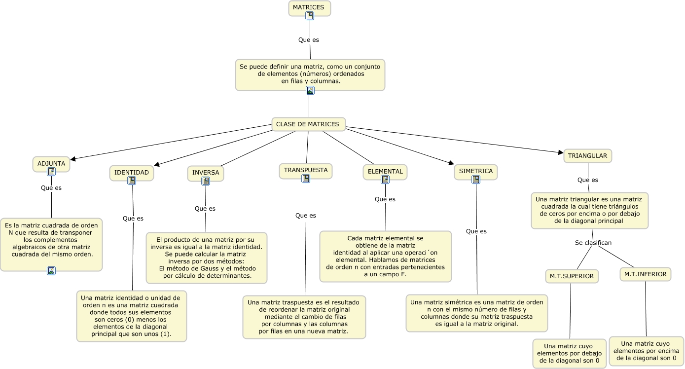 Este Cmap, tiene información relacionada con: matrices, CLASE DE MATRICES ???? TRANSPUESTA, TRIANGULAR Que es Una matriz triangular es una matriz cuadrada la cual tiene triángulos de ceros por encima o por debajo de la diagonal principal, INVERSA Que es El producto de una matriz por su inversa es igual a la matriz identidad. Se puede calcular la matriz inversa por dos métodos: El método de Gauss y el método por cálculo de determinantes., CLASE DE MATRICES ???? ELEMENTAL, Una matriz triangular es una matriz cuadrada la cual tiene triángulos de ceros por encima o por debajo de la diagonal principal Se clasifican M.T.INFERIOR, MATRICES Que es Se puede definir una matriz, como un conjunto de elementos (números) ordenados en filas y columnas., CLASE DE MATRICES ???? TRIANGULAR, CLASE DE MATRICES ???? INVERSA, ELEMENTAL Que es Cada matriz elemental se obtiene de la matriz identidad al aplicar una operaci´on elemental. Hablamos de matrices de orden n con entradas pertenecientes a un campo F., Se puede definir una matriz, como un conjunto de elementos (números) ordenados en filas y columnas. ???? CLASE DE MATRICES, ADJUNTA Que es Es la matriz cuadrada de orden N que resulta de transponer los complementos algebraicos de otra matriz cuadrada del mismo orden., CLASE DE MATRICES ???? SIMETRICA, IDENTIDAD Que es Una matriz identidad o unidad de orden n es una matriz cuadrada donde todos sus elementos son ceros (0) menos los elementos de la diagonal principal que son unos (1)., TRANSPUESTA Que es Una matriz traspuesta es el resultado de reordenar la matriz original mediante el cambio de filas por columnas y las columnas por filas en una nueva matriz., M.T.INFERIOR ???? Una matriz cuyo elementos por encima de la diagonal son 0, Una matriz triangular es una matriz cuadrada la cual tiene triángulos de ceros por encima o por debajo de la diagonal principal Se clasifican M.T.SUPERIOR, CLASE DE MATRICES ???? IDENTIDAD, CLASE DE MATRICES ???? ADJUNTA, SIMETRICA Que es Una matriz simétrica es una matriz de orden n con el mismo número de filas y columnas donde su matriz traspuesta es igual a la matriz original., M.T.SUPERIOR ???? Una matriz cuyo elementos por debajo de la diagonal son 0
