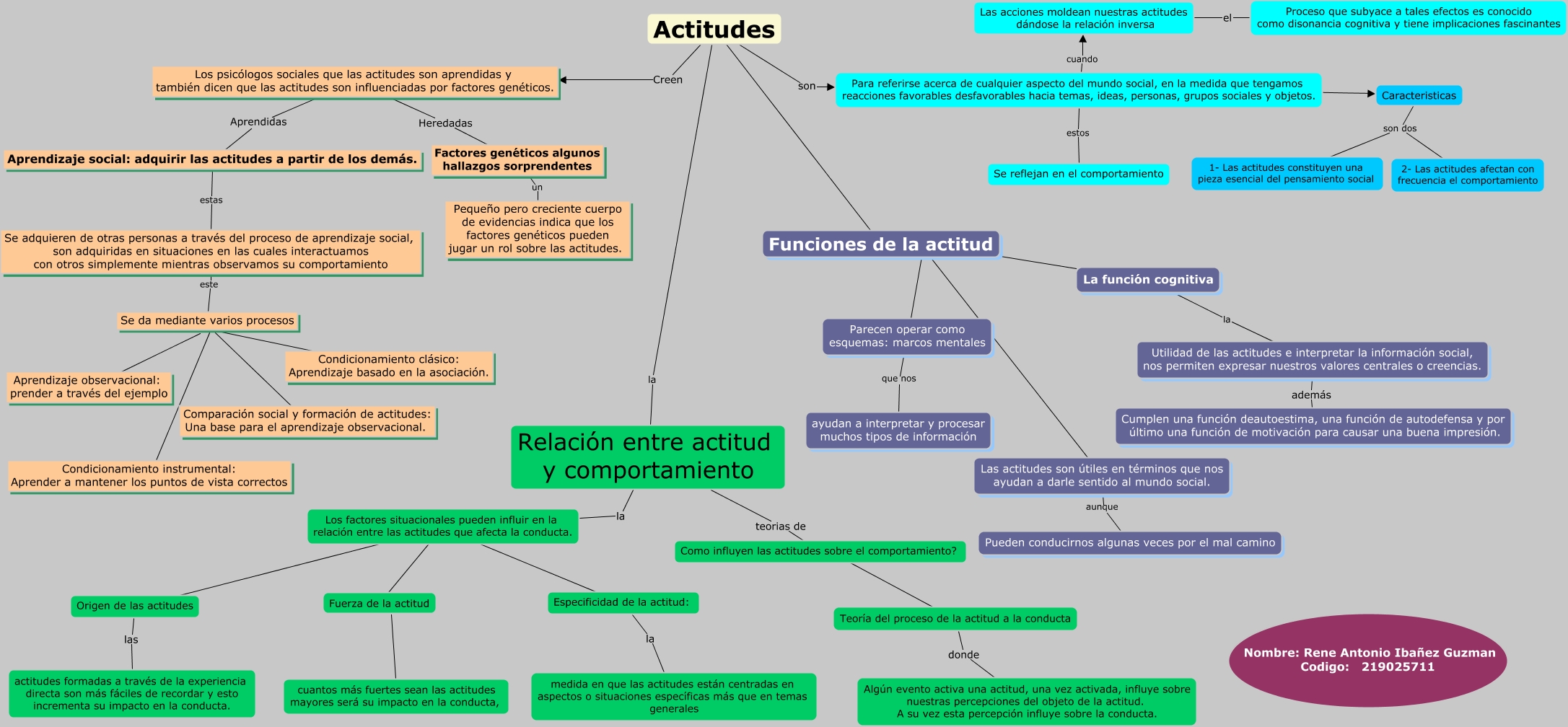 Este Cmap, tiene información relacionada con: Capitulo 4 Actitudes evaluar el mundo social, Teoría del proceso de la actitud a la conducta donde Algún evento activa una actitud, una vez activada, influye sobre nuestras percepciones del objeto de la actitud. A su vez esta percepción influye sobre la conducta., Origen de las actitudes ???? Los factores situacionales pueden influir en la relación entre las actitudes que afecta la conducta., Se adquieren de otras personas a través del proceso de aprendizaje social, son adquiridas en situaciones en las cuales interactuamos con otros simplemente mientras observamos su comportamiento este Se da mediante varios procesos, Especificidad de la actitud: la medida en que las actitudes están centradas en aspectos o situaciones específicas más que en temas generales, Aprendizaje social: adquirir las actitudes a partir de los demás. estas Se adquieren de otras personas a través del proceso de aprendizaje social, son adquiridas en situaciones en las cuales interactuamos con otros simplemente mientras observamos su comportamiento, Relación entre actitud y comportamiento teorias de Como influyen las actitudes sobre el comportamiento?, Funciones de la actitud ???? Actitudes, Condicionamiento clásico: Aprendizaje basado en la asociación. ???? Condicionamiento instrumental: Aprender a mantener los puntos de vista correctos, Origen de las actitudes las actitudes formadas a través de la experiencia directa son más fáciles de recordar y esto incrementa su impacto en la conducta., Condicionamiento clásico: Aprendizaje basado en la asociación. ???? Aprendizaje observacional: prender a través del ejemplo, Para referirse acerca de cualquier aspecto del mundo social, en la medida que tengamos reacciones favorables desfavorables hacia temas, ideas, personas, grupos sociales y objetos. CAratr Caracteristicas, Las actitudes son útiles en términos que nos ayudan a darle sentido al mundo social. aunque Pueden conducirnos algunas veces por el mal camino, Parecen operar como esquemas: marcos mentales que nos ayudan a interpretar y procesar muchos tipos de información, Se da mediante varios procesos ???? Condicionamiento instrumental: Aprender a mantener los puntos de vista correctos, Para referirse acerca de cualquier aspecto del mundo social, en la medida que tengamos reacciones favorables desfavorables hacia temas, ideas, personas, grupos sociales y objetos. estos Se reflejan en el comportamiento, Caracteristicas son dos 1- Las actitudes constituyen una pieza esencial del pensamiento social, Especificidad de la actitud: ???? Los factores situacionales pueden influir en la relación entre las actitudes que afecta la conducta., Se da mediante varios procesos ???? Comparación social y formación de actitudes: Una base para el aprendizaje observacional., Origen de las actitudes ???? Los factores situacionales pueden influir en la relación entre las actitudes que afecta la conducta., Fuerza de la actitud ???? Los factores situacionales pueden influir en la relación entre las actitudes que afecta la conducta.