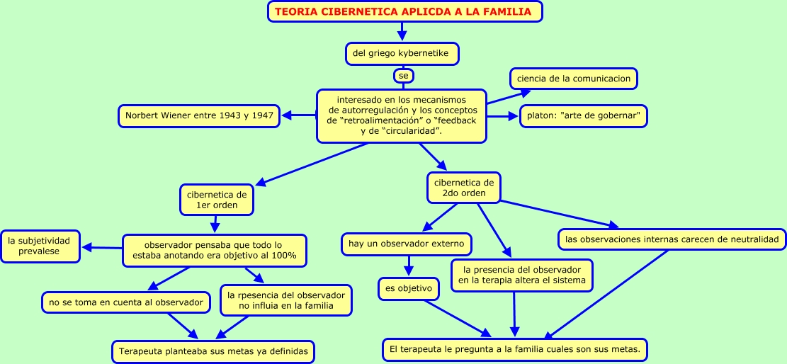 Este Cmap, tiene información relacionada con: cibernetica, hay un observador externo ???? es objetivo, observador pensaba que todo lo estaba anotando era objetivo al 100% ???? la subjetividad prevalese, observador pensaba que todo lo estaba anotando era objetivo al 100% ???? no se toma en cuenta al observador, las observaciones internas carecen de neutralidad ???? ????, interesado en los mecanismos de autorregulación y los conceptos de “retroalimentación” o “feedback y de “circularidad”. ???? cibernetica de 2do orden, la rpesencia del observador no influia en la familia ???? Terapeuta planteaba sus metas ya definidas, cibernetica de 2do orden ???? la presencia del observador en la terapia altera el sistema, cibernetica de 2do orden ???? hay un observador externo, interesado en los mecanismos de autorregulación y los conceptos de “retroalimentación” o “feedback y de “circularidad”. ???? Norbert Wiener entre 1943 y 1947, no se toma en cuenta al observador ???? Terapeuta planteaba sus metas ya definidas, interesado en los mecanismos de autorregulación y los conceptos de “retroalimentación” o “feedback y de “circularidad”. ???? platon: "arte de gobernar", interesado en los mecanismos de autorregulación y los conceptos de “retroalimentación” o “feedback y de “circularidad”. ???? ciencia de la comunicacion, cibernetica de 2do orden ???? las observaciones internas carecen de neutralidad, cibernetica de 1er orden ???? observador pensaba que todo lo estaba anotando era objetivo al 100%, TEORIA CIBERNETICA APLICDA A LA FAMILIA ???? del griego kybernetike, la presencia del observador en la terapia altera el sistema ???? El terapeuta le pregunta a la familia cuales son sus metas., interesado en los mecanismos de autorregulación y los conceptos de “retroalimentación” o “feedback y de “circularidad”. ???? cibernetica de 1er orden, del griego kybernetike se interesado en los mecanismos de autorregulación y los conceptos de “retroalimentación” o “feedback y de “circularidad”., observador pensaba que todo lo estaba anotando era objetivo al 100% ???? la rpesencia del observador no influia en la familia, es objetivo ???? El terapeuta le pregunta a la familia cuales son sus metas.
