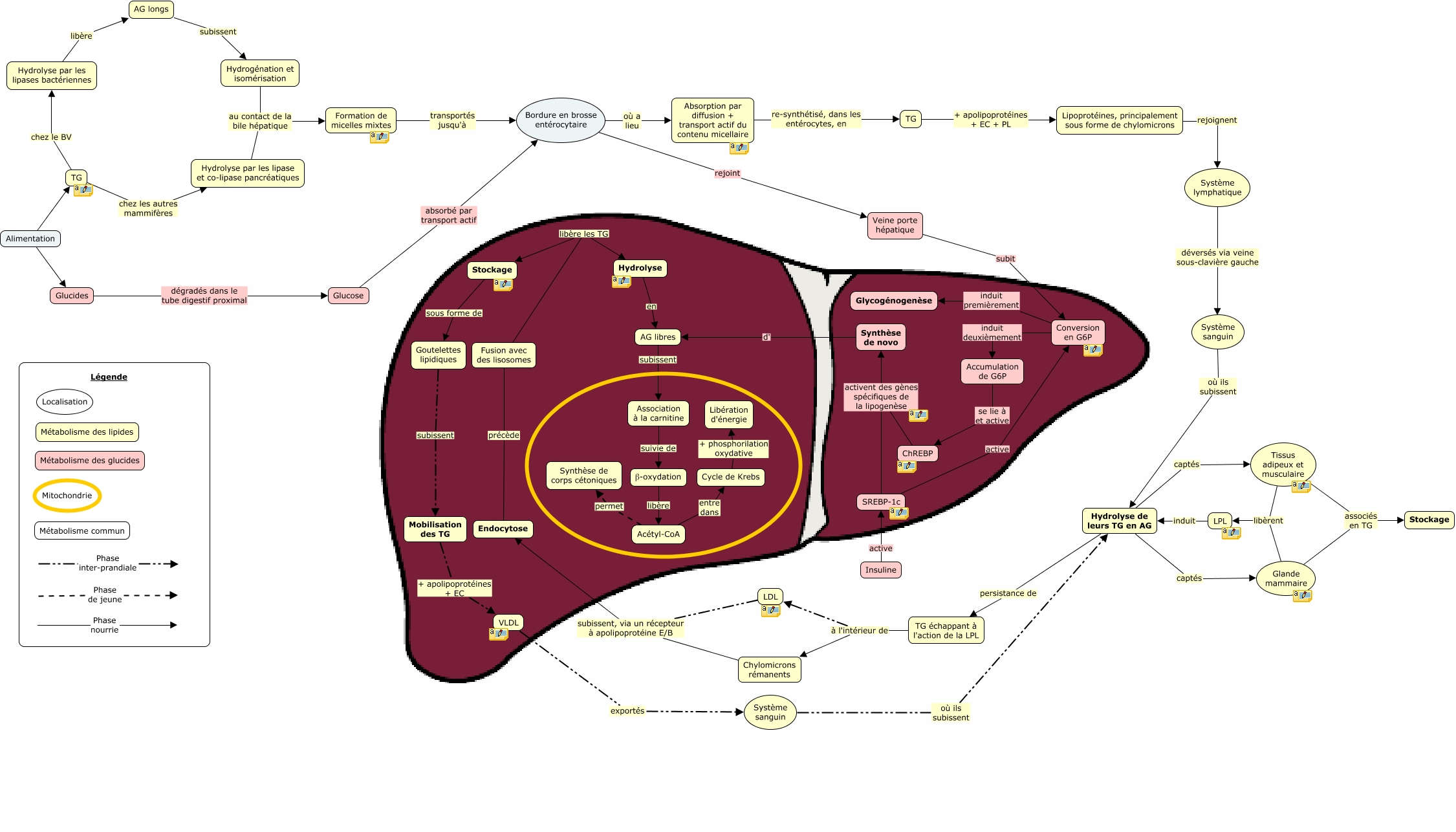 Cette carte de concepts créée avec IHMC CmapTools traite de: Schéma général - mammifères, SREBP-1c activent des gènes spécifiques de la lipogenèse Synthèse de novo, Tissus adipeux et musculaire associés en TG Stockage, LDL subissent, via un récepteur à apolipoprotéine E/B Endocytose, Glande mammaire libèrent LPL, Phase inter-prandiale, Goutelettes lipidiques subissent Mobilisation des TG, Glucides dégradés dans le tube digestif proximal Glucose, Formation de micelles mixtes transportés jusqu'à Bordure en brosse entérocytaire, Hydrolyse par les lipases bactériennes libère AG longs, TG chez les autres mammifères Hydrolyse par les lipase et co-lipase pancréatiques, Veine porte hépatique subit Conversion en G6P, Synthèse de novo d' AG libres, Endocytose précède Fusion avec des lisosomes, AG libres subissent Association à la carnitine, Phase de jeune, Cycle de Krebs + phosphorilation oxydative Libération d'énergie, Fusion avec des lisosomes libère les TG Hydrolyse, Système sanguin où ils subissent Hydrolyse de leurs TG en AG, Glucose absorbé par transport actif Bordure en brosse entérocytaire, TG échappant à l'action de la LPL à l'intérieur de Chylomicrons rémanents