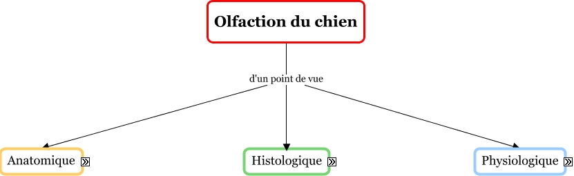 Cette carte de concepts créée avec IHMC CmapTools traite de: Partie muqueuse nasale 1.6, Nez délimité par Os : - Os maxilaire - Os nasal - Os incisif, Muqueuse olfactive composée d'un Epithélium cylindrique pseudostratifié, Muqueuse olfactive composée d'un Chorion, Récepteurs olfactifs - Nerf olfactif (- Nerf terminal) Bulbe olfactif, Récepteurs des "cils" olfactifs caractérisés par - 300 acides aminés - 7 traverses membranaires (+/- 20 acides aminés chacune), Tubercule olfactif se projettent sur Cortex orbitofrontal, Epithélium cylindrique pseudostratifié Avec Cellules de soutien, Aires olfactives primaires :, Sinus paranasaux : - sinus maxillaire - sinus frontal ont pour fontion : - Réchauffement - Humidification - Olfaction - Résonnance des sons - Allègement du poid du crâne - Amortisseur de choc, Liaison aux OBP reconnaissance spécifique Récepteurs des "cils" olfactifs, Molécules Odorantes Volatiles (MOV) solubilisation dans mucus Liaison aux OBP, Molécules Odorantes Volatiles (MOV) sous forme - individuelles (odeur simple) - mélange (odeur complexe), Cortex piriforme se projettent sur Thalamus, axones -nerf olfactif- projet sur Glomérules -bulbes olfactif-, Cartilages : - Alaire - Latéraux dorsal et ventral - Accessoires latéral et médial, Chorion comportant - Tissu conjonctif lâche fibro-élastique - Glandes de Bowman, Anatomique Système nerveux de l'olfaction, Cornets nasaux : - dorsal - moyen - ventral ont pour fonction - Réchauffement - Humidification - Défense (filtration des particules) - Olfaction, Olfaction du chien d'un point de vue Physiologique, Potentiel d'action propage à travers axones -nerf olfactif-