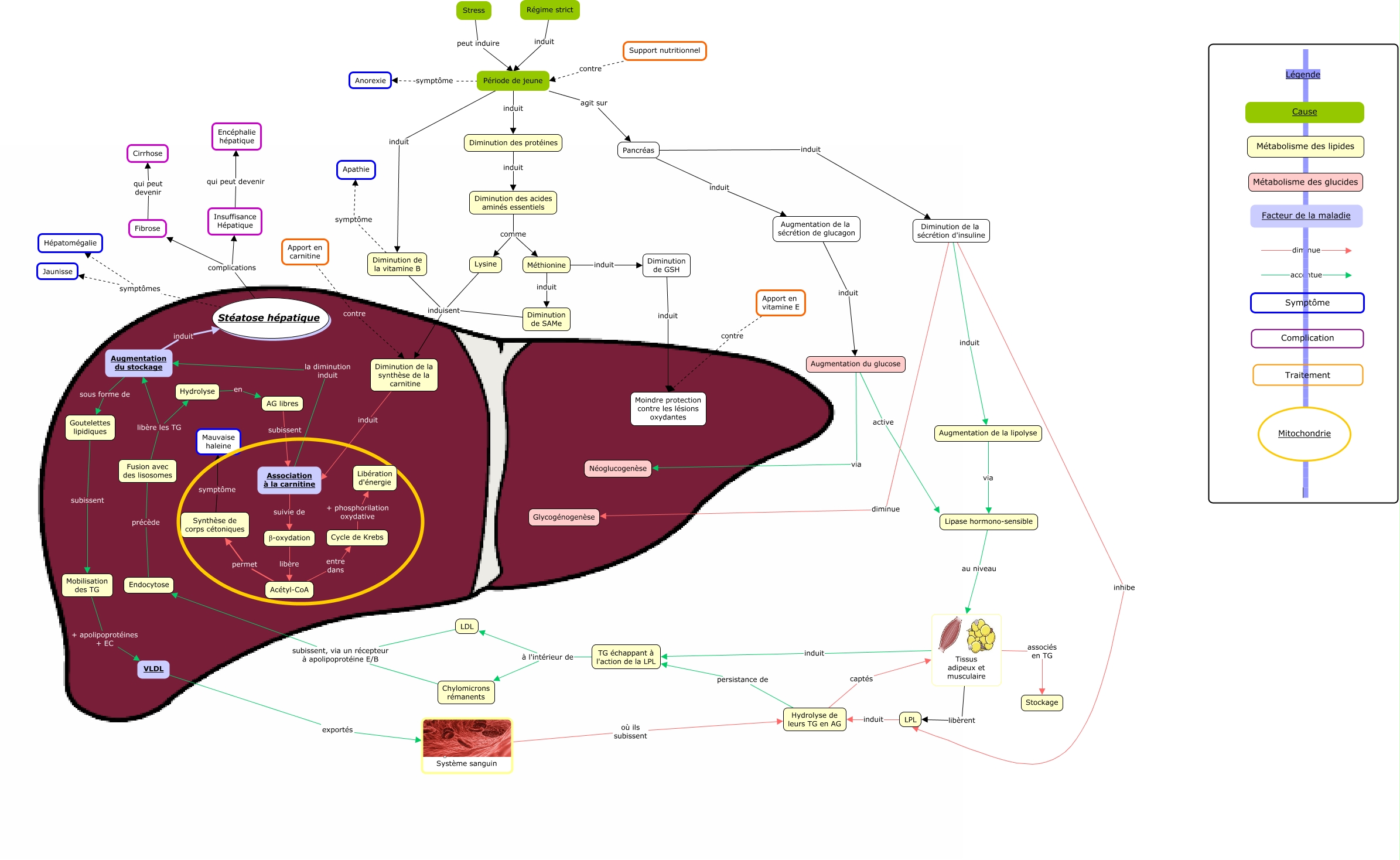 Cette carte de concepts créée avec IHMC CmapTools traite de: SH chat version 3, Diminution de la sécrétion d'insuline diminue Glycogénogenèse, Diminution des acides aminés essentiels comme Lysine, VLDL exportés Système sanguin, Acétyl-CoA permet Synthèse de corps cétoniques, Lipase hormono-sensible au niveau Tissus adipeux et musculaire, Tissus adipeux et musculaire libèrent LPL, Diminution de la synthèse de la carnitine induit Association à la carnitine, Stéatose hépatique symptômes Jaunisse, Diminution de SAMe induisent Diminution de la synthèse de la carnitine, Augmentation du stockage sous forme de Goutelettes lipidiques, Période de jeune induit Diminution des protéines, Synthèse de corps cétoniques symptôme Mauvaise haleine, Diminution de la sécrétion d'insuline induit Augmentation de la lipolyse, AG libres subissent Association à la carnitine, Hydrolyse de leurs TG en AG persistance de TG échappant à l'action de la LPL, Diminution de GSH induit Moindre protection contre les lésions oxydantes, Régime strict induit Période de jeune, Période de jeune agit sur Pancréas, accentue, Hydrolyse en AG libres