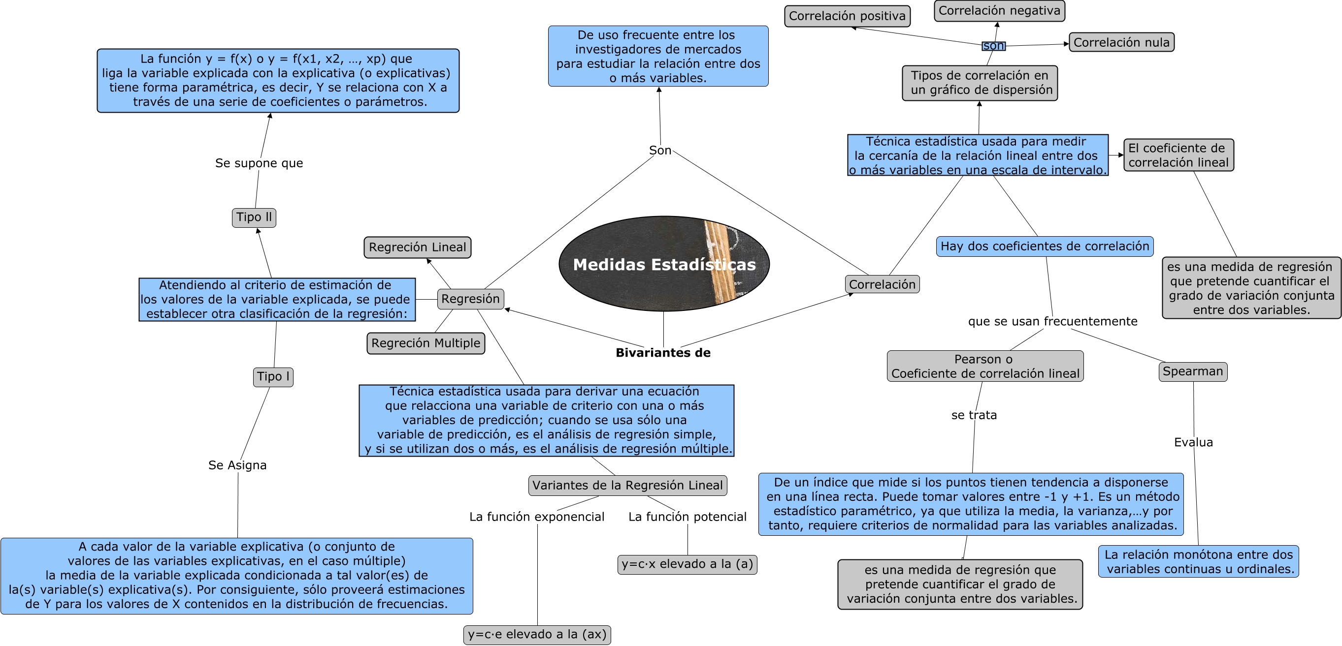 Este Cmap, tiene información relacionada con: Medidas Estadisticas.1, Tipo ll Se supone que La función y = f(x) o y = f(x1, x2, …, xp) que liga la variable explicada con la explicativa (o explicativas) tiene forma paramétrica, es decir, Y se relaciona con X a través de una serie de coeficientes o parámetros., Tipos de correlación en un gráfico de dispersión son Correlación positiva, Correlación Técnica estadística usada para medir la cercanía de la relación lineal entre dos o más variables en una escala de intervalo. El coeficiente de correlación lineal, Correlación Son De uso frecuente entre los investigadores de mercados para estudiar la relación entre dos o más variables., Regresión Atendiendo al criterio de estimación de los valores de la variable explicada, se puede establecer otra clasificación de la regresión: Tipo ll, El coeficiente de correlación lineal ???? es una medida de regresión que pretende cuantificar el grado de variación conjunta entre dos variables., Pearson o Coeficiente de correlación lineal se trata De un índice que mide si los puntos tienen tendencia a disponerse en una línea recta. Puede tomar valores entre -1 y +1. Es un método estadístico paramétrico, ya que utiliza la media, la varianza,…y por tanto, requiere criterios de normalidad para las variables analizadas., Regresión Atendiendo al criterio de estimación de los valores de la variable explicada, se puede establecer otra clasificación de la regresión: Tipo l, Regresión ???? Regreción Multiple, Regresión Técnica estadística usada para derivar una ecuación que relacciona una variable de criterio con una o más variables de predicción; cuando se usa sólo una variable de predicción, es el análisis de regresión simple, y si se utilizan dos o más, es el análisis de regresión múltiple. Variantes de la Regresión Lineal, Tipo l Se Asigna A cada valor de la variable explicativa (o conjunto de valores de las variables explicativas, en el caso múltiple) la media de la variable explicada condicionada a tal valor(es) de la(s) variable(s) explicativa(s). Por consiguiente, sólo proveerá estimaciones de Y para los valores de X contenidos en la distribución de frecuencias., Correlación Técnica estadística usada para medir la cercanía de la relación lineal entre dos o más variables en una escala de intervalo. Hay dos coeficientes de correlación, Hay dos coeficientes de correlación que se usan frecuentemente Spearman, Correlación Técnica estadística usada para medir la cercanía de la relación lineal entre dos o más variables en una escala de intervalo. Tipos de correlación en un gráfico de dispersión, Medidas Estadísticas Bivariantes de Regresión, Regresión Son De uso frecuente entre los investigadores de mercados para estudiar la relación entre dos o más variables., Spearman Evalua La relación monótona entre dos variables continuas u ordinales., Hay dos coeficientes de correlación que se usan frecuentemente Pearson o Coeficiente de correlación lineal, De un índice que mide si los puntos tienen tendencia a disponerse en una línea recta. Puede tomar valores entre -1 y +1. Es un método estadístico paramétrico, ya que utiliza la media, la varianza,…y por tanto, requiere criterios de normalidad para las variables analizadas. es una medida de regresión que pretende cuantificar el grado de variación conjunta entre dos variables., Tipos de correlación en un gráfico de dispersión son Correlación negativa