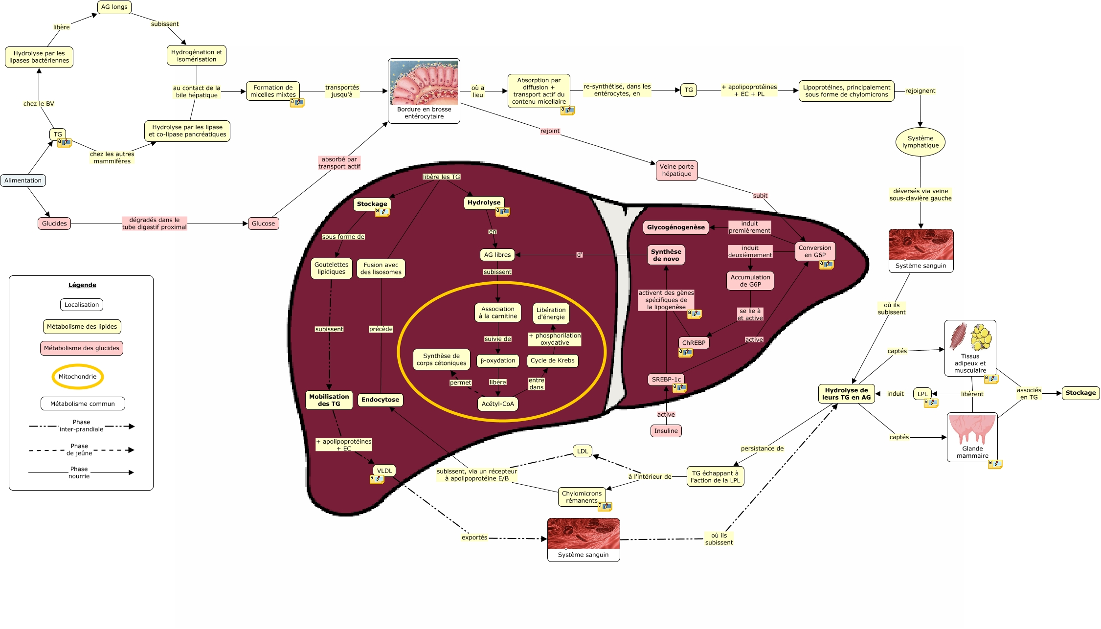 Cette carte de concepts créée avec IHMC CmapTools traite de: Schéma général - mammifères, SREBP-1c activent des gènes spécifiques de la lipogenèse Synthèse de novo, Tissus adipeux et musculaire associés en TG Stockage, LDL subissent, via un récepteur à apolipoprotéine E/B Endocytose, Glande mammaire libèrent LPL, Phase inter-prandiale, Goutelettes lipidiques subissent Mobilisation des TG, Glucides dégradés dans le tube digestif proximal Glucose, Formation de micelles mixtes transportés jusqu'à Bordure en brosse entérocytaire, Hydrolyse par les lipases bactériennes libère AG longs, TG chez les autres mammifères Hydrolyse par les lipase et co-lipase pancréatiques, Veine porte hépatique subit Conversion en G6P, Synthèse de novo d' AG libres, Endocytose précède Fusion avec des lisosomes, AG libres subissent Association à la carnitine, Phase de jeûne, Cycle de Krebs + phosphorilation oxydative Libération d'énergie, Fusion avec des lisosomes libère les TG Hydrolyse, Système sanguin où ils subissent Hydrolyse de leurs TG en AG, Glucose absorbé par transport actif Bordure en brosse entérocytaire, TG échappant à l'action de la LPL à l'intérieur de Chylomicrons rémanents
