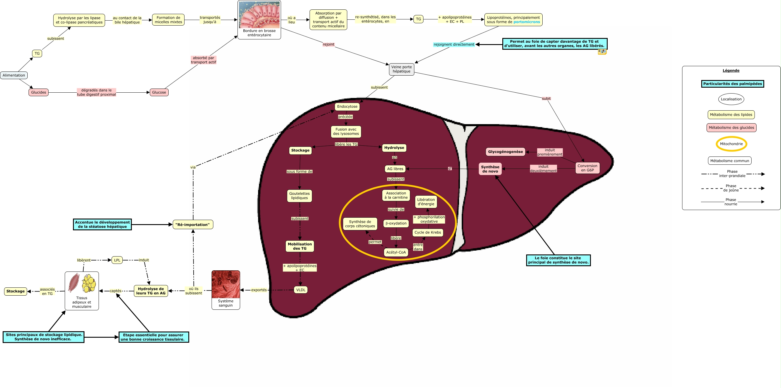 Cette carte de concepts créée avec IHMC CmapTools traite de: Métabolisme des lipides chez les palmipèdes, Système sanguin où ils subissent Hydrolyse de leurs TG en AG, Bordure en brosse entérocytaire où a lieu Absorption par diffusion + transport actif du contenu micellaire, Stockage sous forme de Goutelettes lipidiques, β-oxydation libère Acétyl-CoA, LPL induit Hydrolyse de leurs TG en AG, AG libres subissent Association à la carnitine, Fusion avec des lysosomes libère les TG Stockage, Synthèse de novo d' AG libres, Système sanguin où ils subissent "Ré-importation", Veine porte hépatique subissent Endocytose, Association à la carnitine suivie de β-oxydation, Acétyl-CoA permet Synthèse de corps cétoniques, Hydrolyse par les lipase et co-lipase pancréatiques au contact de la bile hépatique Formation de micelles mixtes, Veine porte hépatique subit Conversion en G6P, Endocytose précède Fusion avec des lysosomes, Alimentation TG, Phase de jeûne, Tissus adipeux et musculaire libèrent LPL, Glucides dégradés dans le tube digestif proximal Glucose, Sites principaux de stockage lipidique. Synthèse de novo inefficace. Etape essentielle pour assurer une bonne croissance tissulaire.