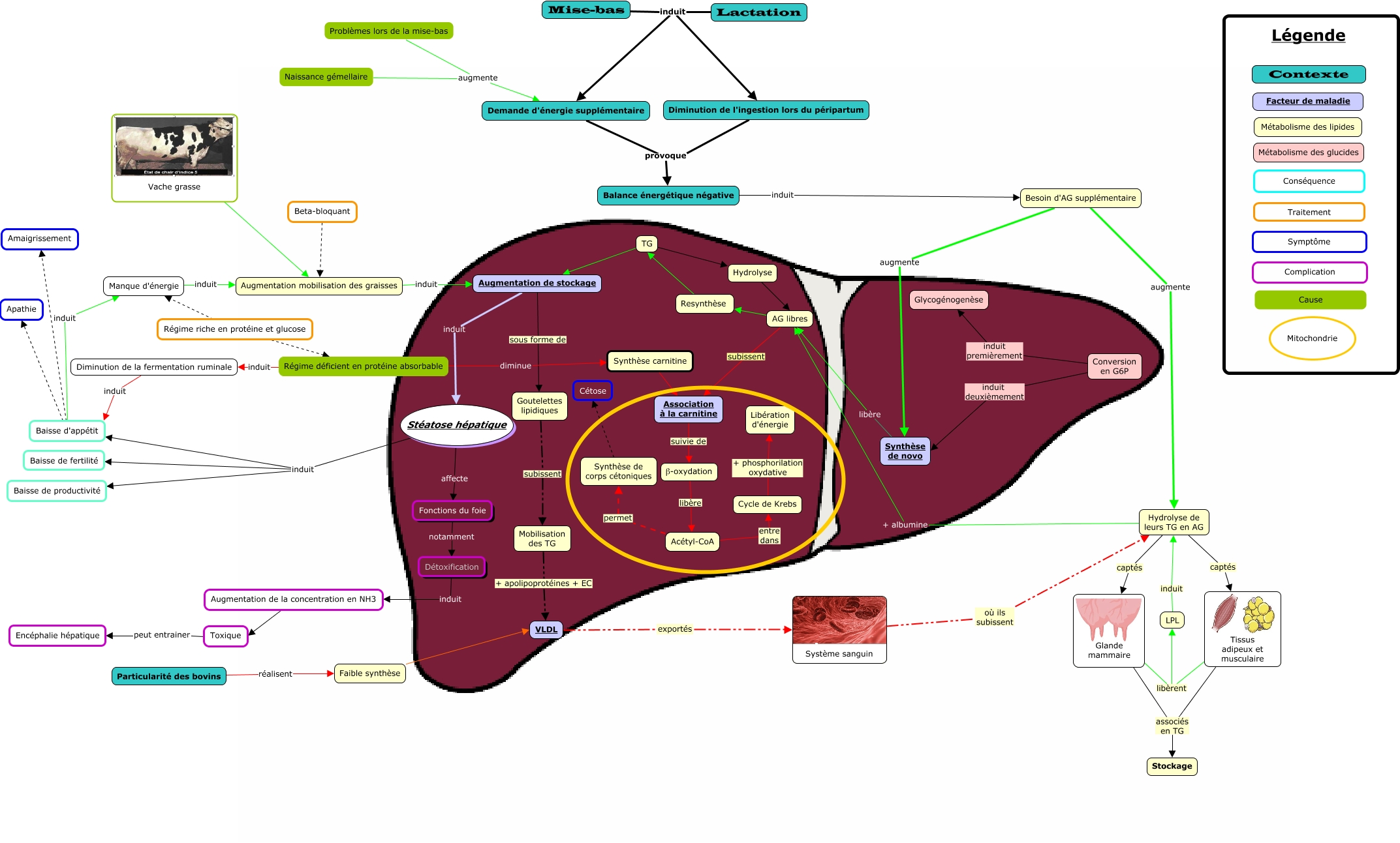 Cette carte de concepts créée avec IHMC CmapTools traite de: Stéatose hépatique chez le bovin, Stéatose hépatique induit Baisse de productivité, Augmentation de stockage induit Stéatose hépatique, Hydrolyse de leurs TG en AG captés Tissus adipeux et musculaire, TG Hydrolyse, Conversion en G6P induit deuxièmement Synthèse de novo, Problèmes lors de la mise-bas augmente Demande d'énergie supplémentaire, Association à la carnitine suivie de β-oxydation, TG Augmentation de stockage, Acétyl-CoA entre dans Cycle de Krebs, Glande mammaire libèrent LPL, Régime riche en protéine et glucose Régime déficient en protéine absorbable, LPL induit Hydrolyse de leurs TG en AG, Augmentation mobilisation des graisses induit Augmentation de stockage, Synthèse carnitine Association à la carnitine, Augmentation de la concentration en NH3 Toxique, Manque d'énergie induit Augmentation mobilisation des graisses, Mise-bas induit Diminution de l'ingestion lors du péripartum, Faible synthèse VLDL, Régime riche en protéine et glucose Manque d'énergie, Augmentation de stockage sous forme de Goutelettes lipidiques