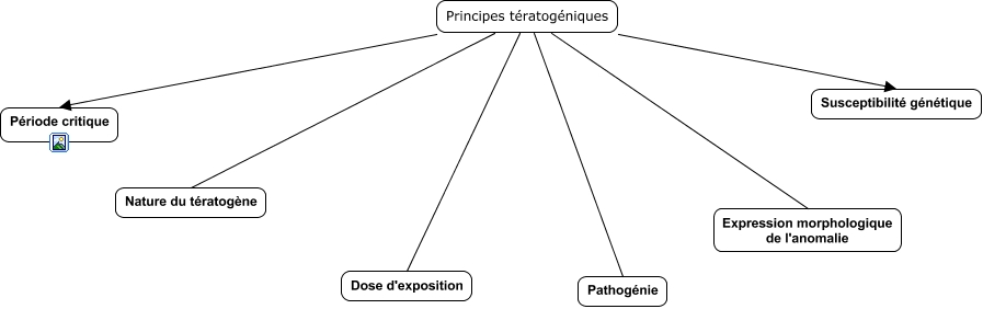 Cette carte de concepts créée avec IHMC CmapTools traite de: Principes tératogéniques, Principes tératogéniques Dose d'exposition, Principes tératogéniques Période critique, Principes tératogéniques Susceptibilité génétique, Principes tératogéniques Pathogénie, Principes tératogéniques Expression morphologique de l'anomalie, Principes tératogéniques Nature du tératogène
