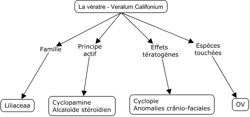 Cette carte de concepts créée avec IHMC CmapTools traite de: La vératre, La vératre - Veralum Califonium Principe actif Cyclopamine Alcaloïde stéroïdien, La vératre - Veralum Califonium Famille Liliaceaa, La vératre - Veralum Califonium Effets tératogènes Cyclopie Anomalies crânio-faciales, La vératre - Veralum Califonium Espèces touchées OV