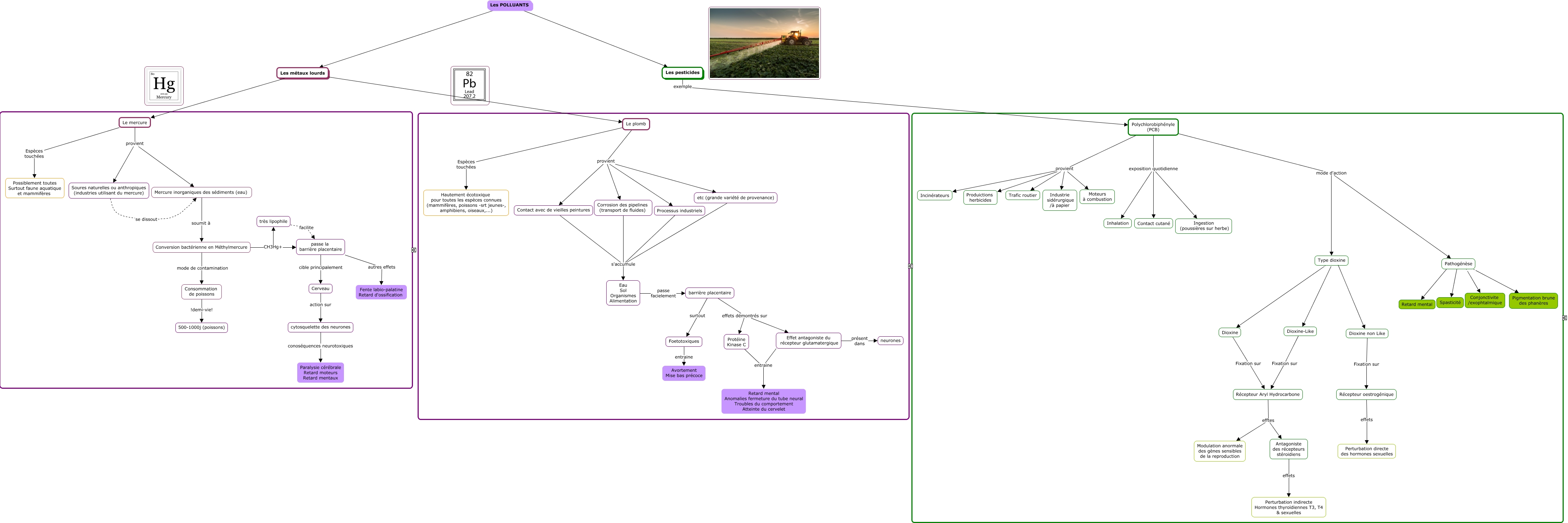 Cette carte de concepts créée avec IHMC CmapTools traite de: Les polluants, Conversion bactérienne en Méthylmercure CH3Hg+ très lipophile, Les métaux lourds Le mercure, Le mercure Espèces touchées Possiblement toutes Surtout faune aquatique et mammifères, Processus industriels s'accumule Eau Sol Organismes Alimentation, Polychlorobiphényle (PCB) exposition quotidienne Contact cutané, Conversion bactérienne en Méthylmercure CH3Hg+ passe la barrière placentaire, Dioxine Fixation sur Récepteur Aryl Hydrocarbone, Antagoniste des récepteurs stéroidiens effets Perturbation indirecte Hormones thyroïdiennes T3, T4 & sexuelles, Les pesticides exemple Polychlorobiphényle (PCB), Le plomb Espèces touchées Hautement écotoxique pour toutes les espèces connues (mammifères, poissons -srt jeunes-, amphibiens, oiseaux,...), Polychlorobiphényle (PCB) mode d'action Type dioxine, Conversion bactérienne en Méthylmercure CH3Hg+ passe la barrière placentaire, Eau Sol Organismes Alimentation passe facielement barrière placentaire, Pathogénèse Pigmentation brune des phanères, Dioxine non Like Fixation sur Récepteur oestrogénique, Polychlorobiphényle (PCB) provient Moteurs à combustion, Type dioxine Dioxine non Like, Le plomb provient etc (grande variété de provenance), Soures naturelles ou anthropiques (industries utilisant du mercure) se dissout Mercure inorganiques des sédiments (eau), Contact avec de vieilles peintures s'accumule Eau Sol Organismes Alimentation