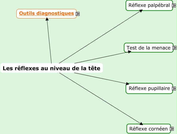 Cette carte de concepts créée avec IHMC CmapTools traite de: Carte 3 Réflexes au niveau de la tête, Illustration, Réflexe pupillaire Interprétation - Réflexe normal : tous les éléments de la voie nerveuse sont intègres. Les réflexe est bilatéral, la diminution du diamètre de la pupille doit s'observer au niveau des deux yeux. - Réflexe absent ou diminué : . Des deux côtés : lésion au niveau du nerf optique. . D'un côté : lésion au niveau des fibres parasympathiques du nerf oculomoteur (du côté qui correspond à l'absence de réflexe)., Test de la menace Arc réflexe, Réflexe pupillaire Mise en situation Maintenir la tête du chien et faire passer le rayon lumineux sur un des deux yeux. C'est un réflexe bilatéral, il faut donc observer une diminution du diamètre de la pupille des deux yeux., Test de la menace Interprétation - Réflexe normal : tous les éléments de la voie nerveuse sont intègres. Le réflexe est bilatéral, la fermeture des paupières doit donc être observée au niveau des deux yeux. - Réflexe absent ou diminué : . Des deux côtés : lésion au niveau du nerf optique. . D'un côté : lésion au niveau du nerf facial (du côté qui correspond à l'absence de réflexe)., Illustration, Réflexe palpébral Mise en situation Maintenir la tête du chien et stimuler les zones autour de l’œil avec un doigt ou un coton tige. Attention à ne pas ajouter un test de la menace., Les réflexes au niveau de la tête, Les réflexes au niveau de la tête Réflexe palpébral, Réflexe pupillaire Arc réflexe, Réflexe cornéen Interprétation - Réflexe normal : tous les éléments de la voie nerveuse sont intègres. Le réflexe est bilatéral, la fermeture des paupières doit donc s'observer au niveau des deux yeux. - Réflexe absent ou diminué: . Des deux côtés : lésion au niveau du nerf trijumeau. . D'un côté : lésion au niveau du nerf facial (du côté qui correspond à l'absence de réflexe)., Réflexe palpébral Arc réflexe, Réflexe cornéen Mise en situation Effectuer une excitation douce de la cornée avec un coton. C'est un réflexe bilatéral, il faut donc observer la fermeture des paupières des deux yeux. Ce test permet de vérifier que l'animal est vivant par exemple lors des anesthésies, même profondes (contrairement au réflexe palpébral)., Les réflexes au niveau de la tête Réflexe pupillaire, Test de la menace Mise en situation Approcher la main vers l’œil de manière rapide et brève sans toucher l'animal. C'est un réflexe bilatéral, il faut donc observer la fermeture des paupières des deux yeux., Réflexe cornéen Arc réflexe, Les réflexes au niveau de la tête Réflexe cornéen, Illustration, Les réflexes au niveau de la tête Test de la menace, Illustration