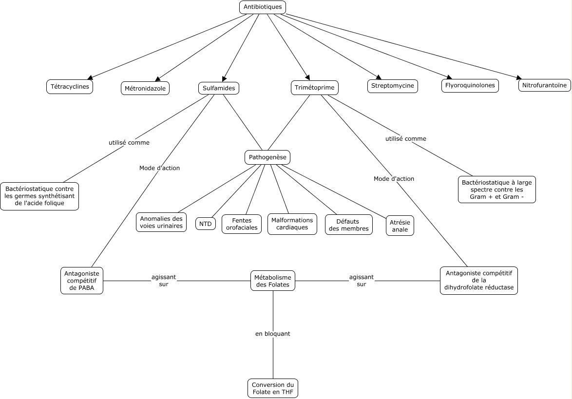 Cette carte de concepts créée avec IHMC CmapTools traite de: Antibiotiques, Sulfamides Mode d'action Antagoniste compétitif de PABA, Antibiotiques Tétracyclines, Trimétoprime Mode d'action Antagoniste compétitif de la dihydrofolate réductase, Pathogenèse NTD, Antibiotiques Streptomycine, Métabolisme des Folates en bloquant Conversion du Folate en THF, Antagoniste compétitif de PABA agissant sur Métabolisme des Folates, Trimétoprime Pathogenèse, Antibiotiques Nitrofurantoïne, Antibiotiques Métronidazole, Pathogenèse Anomalies des voies urinaires, Pathogenèse Défauts des membres, Trimétoprime utilisé comme Bactériostatique à large spectre contre les Gram + et Gram -, Sulfamides Pathogenèse, Antagoniste compétitif de la dihydrofolate réductase agissant sur Métabolisme des Folates, Sulfamides utilisé comme Bactériostatique contre les germes synthétisant de l'acide folique, Pathogenèse Atrésie anale, Pathogenèse Malformations cardiaques, Antibiotiques Trimétoprime, Antibiotiques Sulfamides