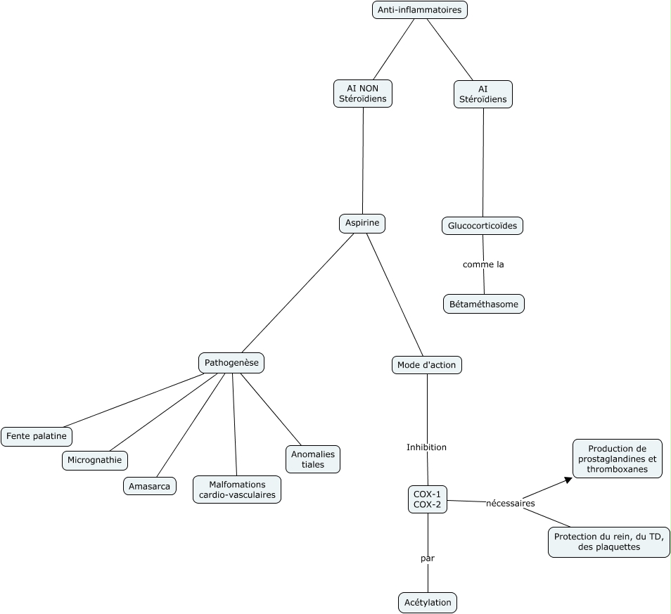 Cette carte de concepts créée avec IHMC CmapTools traite de: Anti-inflammatoires, Anti-inflammatoires AI Stéroïdiens, COX-1 COX-2 par Acétylation, Pathogenèse Micrognathie, Anti-inflammatoires AI NON Stéroïdiens, COX-1 COX-2 nécessaires Production de prostaglandines et thromboxanes, Pathogenèse Fente palatine, Glucocorticoïdes comme la Bétaméthasome, Aspirine Mode d'action, Pathogenèse Malfomations cardio-vasculaires, AI NON Stéroïdiens Aspirine, Aspirine Pathogenèse, Mode d'action Inhibition COX-1 COX-2, COX-1 COX-2 nécessaires Protection du rein, du TD, des plaquettes, AI Stéroïdiens Glucocorticoïdes, Pathogenèse Anomalies tiales, Pathogenèse Amasarca