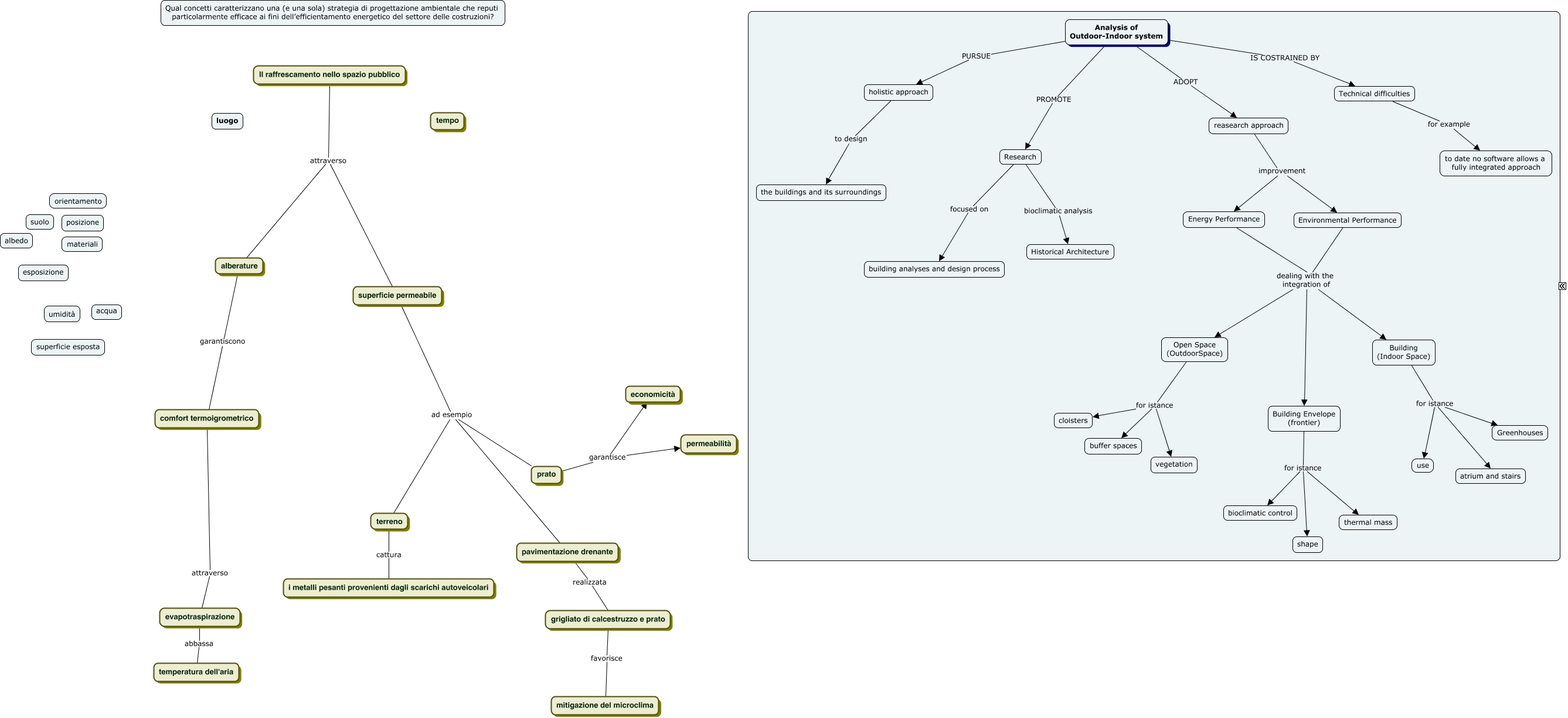 Questa Cmap, creata con IHMC CmapTools, contiene informazioni relative a: G3.1_Lista dei Concetti_2MappaCognitiva, superficie permeabile ad esempio prato, grigliato di calcestruzzo e prato favorisce mitigazione del microclima, Research focused on building analyses and design process, evapotraspirazione abbassa temperatura dell'aria, Building Envelope (frontier) for istance bioclimatic control, Building Envelope (frontier) for istance thermal mass, Energy Performance dealing with the integration of Building (Indoor Space), superficie permeabile ad esempio pavimentazione drenante, Energy Performance dealing with the integration of Building Envelope (frontier), prato garantisce permeabilità, Building Envelope (frontier) for istance shape, reasearch approach improvement Environmental Performance, prato garantisce economicità, alberature garantiscono comfort termoigrometrico, Environmental Performance dealing with the integration of Building Envelope (frontier), pavimentazione drenante realizzata grigliato di calcestruzzo e prato, comfort termoigrometrico attraverso evapotraspirazione, Analysis of Outdoor-Indoor system PURSUE holistic approach, holistic approach to design the buildings and its surroundings, Environmental Performance dealing with the integration of Building (Indoor Space)