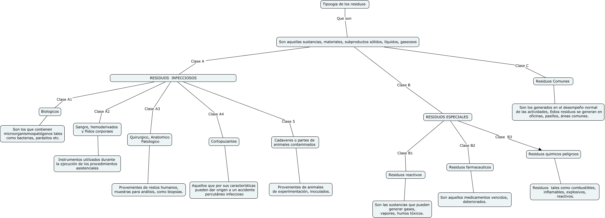 Este Cmap, tiene información relacionada con: mapa conceptual, RESIDUOS ESPECIALES Clase B3 Residuos quimicos peligroos, Son aquellas sustancias, materiales, subproductos sólidos, líquidos, gaseosos Clase B RESIDUOS ESPECIALES, RESIDUOS ESPECIALES Clase B2 Residuos farmaceuticos, RESIDUOS INFECCIOSOS Clase A4 Cortopuzantes, RESIDUOS INFECCIOSOS Clase 5 Cadaveres o partes de animales contaminados, Sangre, hemoderivados y flidos corporaes ???? Instrumentos utilizados durante la ejecución de los procedimientos asistenciales, Residuos Comunes ???? Son los generados en el desempeño normal de las actividades, Estos residuos se generan en oficinas, pasillos, áreas comunes., Residuos farmaceuticos ???? Son aquellos medicamentos vencidos, deteriorados., RESIDUOS INFECCIOSOS Clase A1 Biologicos, RESIDUOS ESPECIALES Clase B1 Residuos reactivos, Son aquellas sustancias, materiales, subproductos sólidos, líquidos, gaseosos Clase C Residuos Comunes, RESIDUOS INFECCIOSOS Clase A3 Quirurgico, Anatomico Patologico, Residuos quimicos peligroos ???? Residuos tales como combustibles, inflamables, explosivos, reactivos., Biologicos ???? Son los que contienen microorganismospatógenos tales como bacterias, parásitos etc., Son aquellas sustancias, materiales, subproductos sólidos, líquidos, gaseosos Clase A RESIDUOS INFECCIOSOS, Tipoogia de los residuos Que son Son aquellas sustancias, materiales, subproductos sólidos, líquidos, gaseosos, Quirurgico, Anatomico Patologico ???? Provenientes de restos humanos, muestras para análisis, como biopsias., Cortopuzantes ???? Aquellos que por sus características pueden dar origen a un accidente percutáneo infeccioso, Residuos reactivos ???? Son las sustancias que pueden generar gases, vapores, humos tóxicos., Cadaveres o partes de animales contaminados ???? Provenientes de animales de experimentación, inoculados.