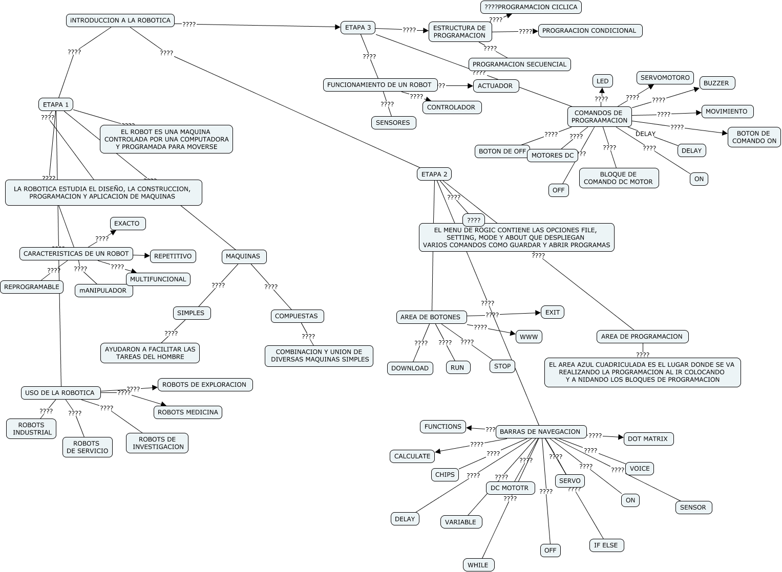 Este Cmap, tiene información relacionada con: ROBOTICA, AREA DE BOTONES ???? WWW, BARRAS DE NAVEGACION ???? SERVO, BARRAS DE NAVEGACION ???? VARIABLE, BARRAS DE NAVEGACION ???? FUNCTIONS, iNTRODUCCION A LA ROBOTICA ???? ETAPA 3, iNTRODUCCION A LA ROBOTICA ???? ETAPA 1, ETAPA 3 ???? FUNCIONAMIENTO DE UN ROBOT, ESTRUCTURA DE PROGRAMACION ???? ????PROGRAMACION CICLICA, BARRAS DE NAVEGACION ???? WHILE, AREA DE BOTONES ???? STOP, MAQUINAS ???? COMPUESTAS, COMANDOS DE PROGRAAMACION DELAY DELAY, ETAPA 1 ???? CARACTERISTICAS DE UN ROBOT, BARRAS DE NAVEGACION ???? ON, CARACTERISTICAS DE UN ROBOT ???? REPROGRAMABLE, AREA DE BOTONES ???? RUN, CARACTERISTICAS DE UN ROBOT ???? mANIPULADOR, iNTRODUCCION A LA ROBOTICA ???? ETAPA 2, AREA DE BOTONES ???? EXIT, COMANDOS DE PROGRAAMACION ???? BUZZER