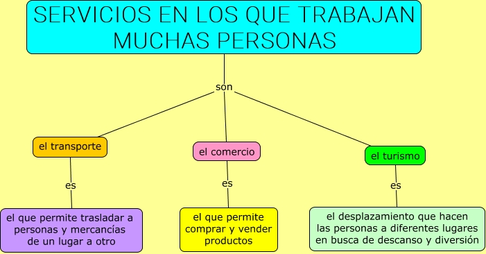 Este Cmap, tiene información relacionada con: Servicios en los que trabbajan muchas personas, SERVICIOS EN LOS QUE TRABAJAN MUCHAS PERSONAS son el transporte, SERVICIOS EN LOS QUE TRABAJAN MUCHAS PERSONAS son el turismo, el comercio es el que permite comprar y vender productos, el transporte es el que permite trasladar a personas y mercancías de un lugar a otro, el turismo es el desplazamiento que hacen las personas a diferentes lugares en busca de descanso y diversión, SERVICIOS EN LOS QUE TRABAJAN MUCHAS PERSONAS son el comercio