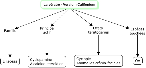 Cette carte de concepts créée avec IHMC CmapTools traite de: La vératre, La vératre - Veralum Califonium Principe actif Cyclopamine Alcaloïde stéroïdien, La vératre - Veralum Califonium Famille Liliaceaa, La vératre - Veralum Califonium Effets tératogènes Cyclopie Anomalies crânio-faciales, La vératre - Veralum Califonium Espèces touchées OV