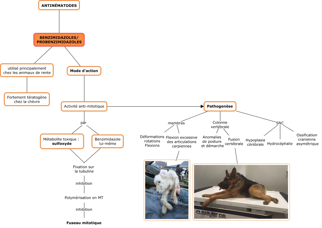 Cette carte de concepts créée avec IHMC CmapTools traite de: Antinématodes, Benzimidazole lui-même Fixation sur la tubuline, Activité anti-mitotique par Benzimidazole lui-même, Pathogenèse SNC Hydrocéphalie, Pathogenèse SNC Hypoplasie cérébrale, Fixation sur la tubuline inhibition Polymérisation en MT, Pathogenèse membres Déformations rotations Flexions, Mode d'action Activité anti-mitotique, Activité anti-mitotique Pathogenèse, utilisé principalement chez les animaux de rente Fortement tératogène chez la chèvre, Pathogenèse Colonne vertébrale Fusion vertébrale, Polymérisation en MT inhibition Fuseau mitotique, Flexion excessive des articulations carpiennes, Pathogenèse membres Flexion excessive des articulations carpiennes, BENZIMIDAZOLES/ PROBENZIMIDAZOLES utilisé principalement chez les animaux de rente, Fusion vertébrale, Activité anti-mitotique par Métabolite toxique : sulfoxyde, Pathogenèse Colonne vertébrale Anomalies de posture et démarche, ANTINÉMATODES BENZIMIDAZOLES/ PROBENZIMIDAZOLES, Métabolite toxique : sulfoxyde Fixation sur la tubuline, Pathogenèse SNC Ossification cranienne asymétrique
