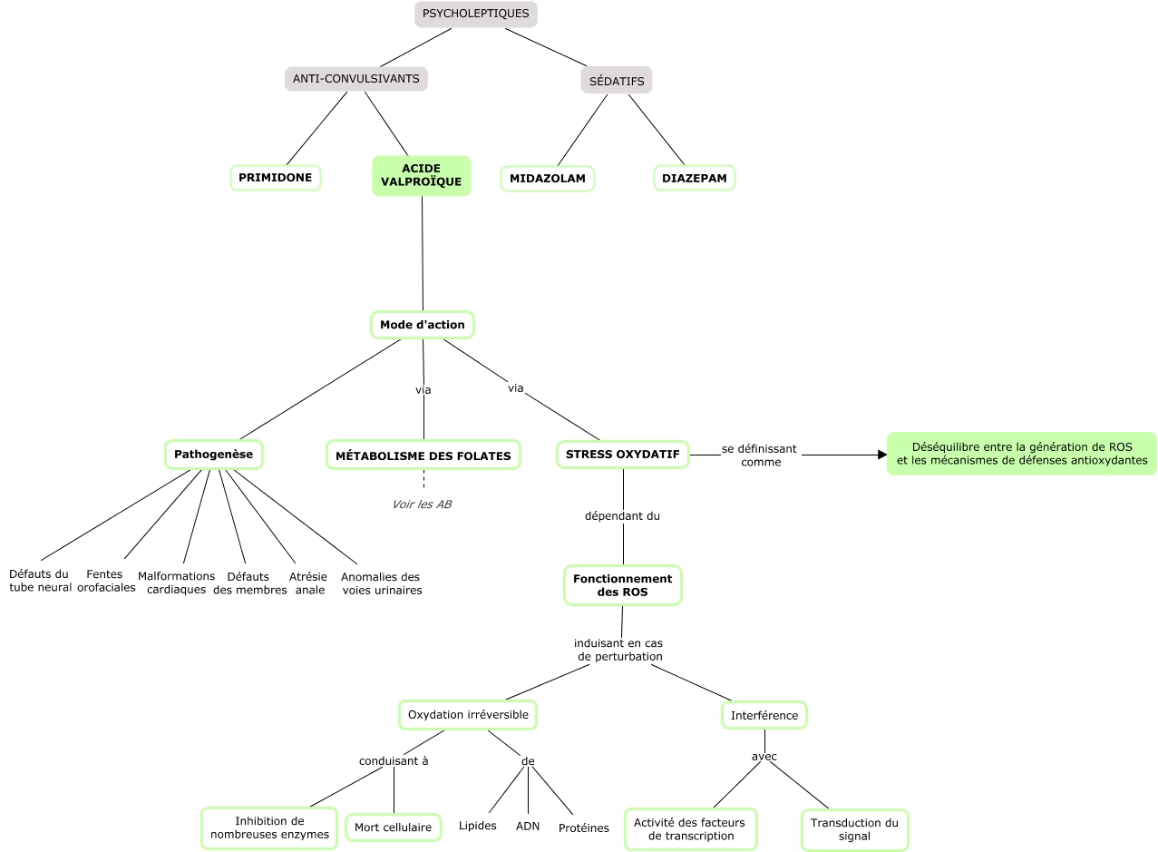 Cette carte de concepts créée avec IHMC CmapTools traite de: Psycholeptiques, STRESS OXYDATIF dépendant du Fonctionnement des ROS, Fonctionnement des ROS induisant en cas de perturbation Interférence, Pathogenèse Défauts du tube neural, Oxydation irréversible conduisant à Mort cellulaire, Pathogenèse Défauts des membres, Pathogenèse Malformations cardiaques, MÉTABOLISME DES FOLATES Voir les AB, Pathogenèse Anomalies des voies urinaires, STRESS OXYDATIF se définissant comme Déséquilibre entre la génération de ROS et les mécanismes de défenses antioxydantes, Oxydation irréversible conduisant à Inhibition de nombreuses enzymes, SÉDATIFS MIDAZOLAM, Pathogenèse Atrésie anale, Pathogenèse Fentes orofaciales, SÉDATIFS DIAZEPAM, ACIDE VALPROÏQUE Mode d'action, Mode d'action via MÉTABOLISME DES FOLATES, ANTI-CONVULSIVANTS PRIMIDONE, Oxydation irréversible de Protéines, Fonctionnement des ROS induisant en cas de perturbation Oxydation irréversible, Interférence avec Activité des facteurs de transcription