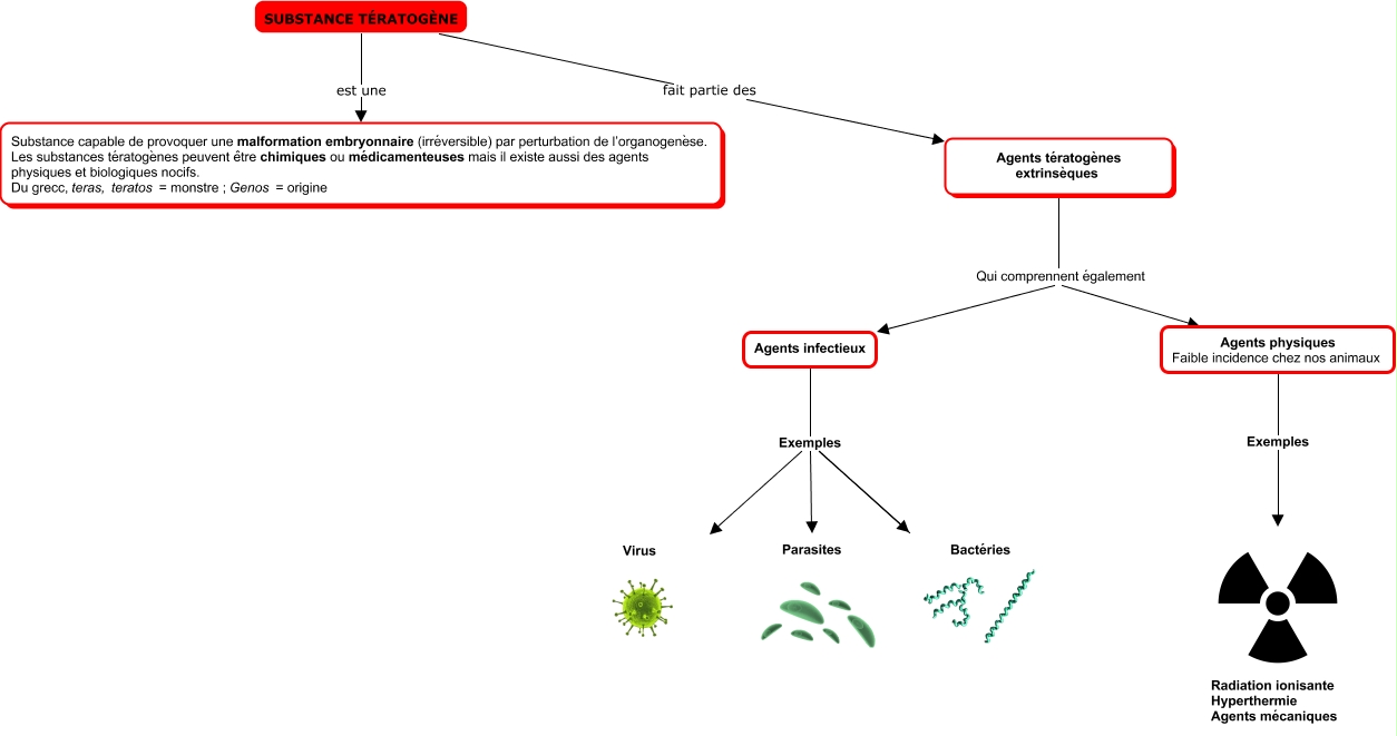 Cette carte de concepts créée avec IHMC CmapTools traite de: Copie de Copie de Définition Virg, Agents physiques Faible incidence chez nos animaux Exemples Radiation ionisante Hyperthermie Agents mécaniques, Agents infectieux Exemples Bactéries, Agents tératogènes extrinsèques Qui comprennent également Agents infectieux, SUBSTANCE TÉRATOGÈNE fait partie des Agents tératogènes extrinsèques, Agents tératogènes extrinsèques Qui comprennent également Agents physiques Faible incidence chez nos animaux, SUBSTANCE TÉRATOGÈNE est une Substance capable de provoquer une malformation embryonnaire (irréversible) par perturbation de l’organogenèse. Les substances tératogènes peuvent être chimiques ou médicamenteuses mais il existe aussi des agents physiques et biologiques nocifs. Du grecc, teras, teratos = monstre ; Genos = origine, Agents infectieux Exemples Virus, Agents infectieux Exemples Bactéries, Agents infectieux Exemples Parasites