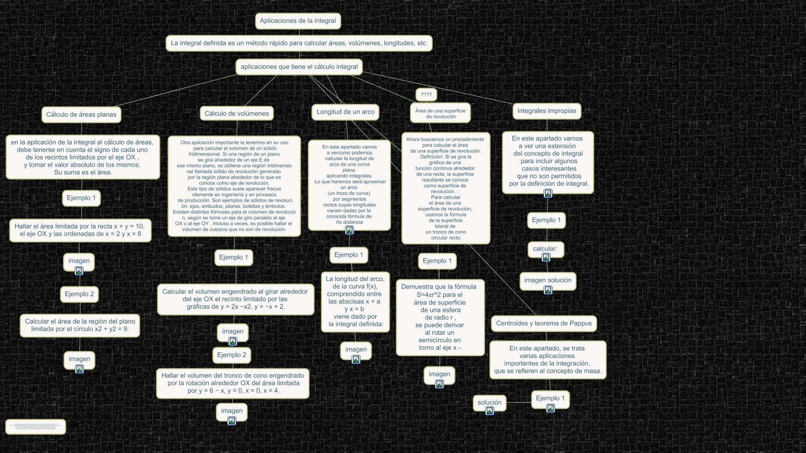 Este Cmap, tiene información relacionada con: punto 1, Longitud de un arco ???? aplicaciones que tiene el cálculo integral, Ejemplo 1 ???? En este apartado, se trata varias aplicaciones importantes de la integración, que se refieren al concepto de masa., Aplicaciones de la integral ???? La integral definida es un método rápido para calcular áreas, volúmenes, longitudes, etc., imagen solución ???? calcular:, Calcular el área de la región del plano limitada por el círculo x2 + y2 = 9. ???? Ejemplo 2, Ejemplo 1 ???? En este apartado vamos a vercomo podemos calcular la longitud de arco de una curva plana aplicando integrales. Lo que haremos será aproximar un arco (un trozo de curva) por segmentos rectos cuyas longitudes vienen dadas por la conocida fórmula de ña distancia, Cálculo de volúmenes ???? aplicaciones que tiene el cálculo integral, En este apartado, se trata varias aplicaciones importantes de la integración, que se refieren al concepto de masa. ???? Centroides y teorema de Pappus, Hallar el volumen del tronco de cono engendrado por la rotación alrededor OX del área limitada por y = 6 − x, y = 0, x = 0, x = 4. ???? Ejemplo 2, calcular: ???? Ejemplo 1, La longitud del arco, de la curva f(x), comprendido entre las abscisas x = a y x = b viene dado por la integral definida: ???? Ejemplo 1, Ejemplo 1 ???? Ahora buscamos un procedimiento para calcular el área de una superficie de revolución. Definición: Si se gira la gráfica de una función continua alrededor de una recta, la superficie resultante se conoce como superficie de revolución. ✍ Para calcular el área de una superficie de revolución, usamos la fórmula de la superficie lateral de un tronco de cono circular recto., Ejemplo 1 ???? en la aplicación de la integral al cálculo de áreas, debe tenerse en cuenta el signo de cada uno de los recintos limitados por el eje OX , y tomar el valor absoluto de los mismos. Su suma es el área., solución ???? Ejemplo 1, imagen ???? Calcular el área de la región del plano limitada por el círculo x2 + y2 = 9., Ejemplo 1 ???? Otra aplicación importante la tenemos en su uso para calcular el volumen de un sólido tridimensional. Si una región de un plano se gira alrededor de un eje E de ese mismo plano, se obtiene una región tridimensio nal llamada sólido de revolución generado por la región plana alrededor de lo que se conoce como eje de revolución. Este tipo de sólidos suele aparecer frecue ntemente en ingeniería y en procesos de producción. Son ejemplos de sólidos de revoluci ón: ejes, embudos, pilares, botellas y émbolos. Existen distintas fórmulas para el volumen de revolució n, según se tome un eje de giro paralelo al eje OX o al eje OY . Incluso a veces, es posible hallar el volumen de cuerpos que no son de revolución., imagen ???? Hallar el volumen del tronco de cono engendrado por la rotación alrededor OX del área limitada por y = 6 − x, y = 0, x = 0, x = 4., Otra aplicación importante la tenemos en su uso para calcular el volumen de un sólido tridimensional. Si una región de un plano se gira alrededor de un eje E de ese mismo plano, se obtiene una región tridimensio nal llamada sólido de revolución generado por la región plana alrededor de lo que se conoce como eje de revolución. Este tipo de sólidos suele aparecer frecue ntemente en ingeniería y en procesos de producción. Son ejemplos de sólidos de revoluci ón: ejes, embudos, pilares, botellas y émbolos. Existen distintas fórmulas para el volumen de revolució n, según se tome un eje de giro paralelo al eje OX o al eje OY . Incluso a veces, es posible hallar el volumen de cuerpos que no son de revolución. ???? Cálculo de volúmenes, Cálculo de áreas planas ???? aplicaciones que tiene el cálculo integral, Ejemplo 2 ???? imagen