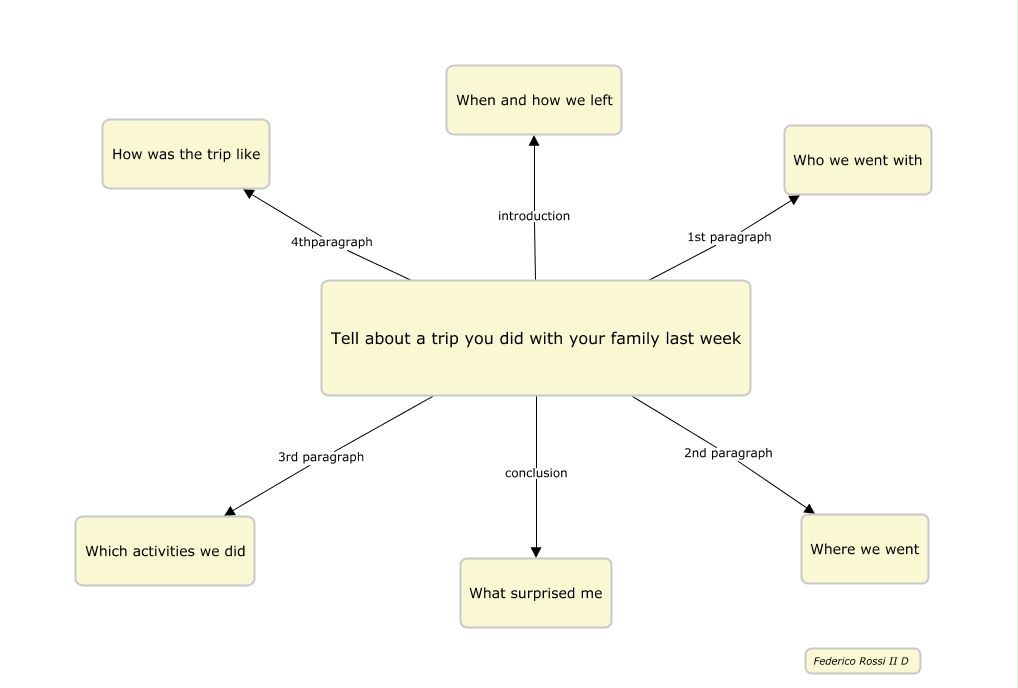 Questa Cmap, creata con IHMC CmapTools, contiene informazioni relative a: fede inglese topic 1, Tell about a trip you did with your family last week conclusion What surprised me, Tell about a trip you did with your family last week 2nd paragraph Where we went, Tell about a trip you did with your family last week introduction When and how we left, Tell about a trip you did with your family last week 3rd paragraph Which activities we did, Tell about a trip you did with your family last week 1st paragraph Who we went with, Tell about a trip you did with your family last week 4thparagraph How was the trip like