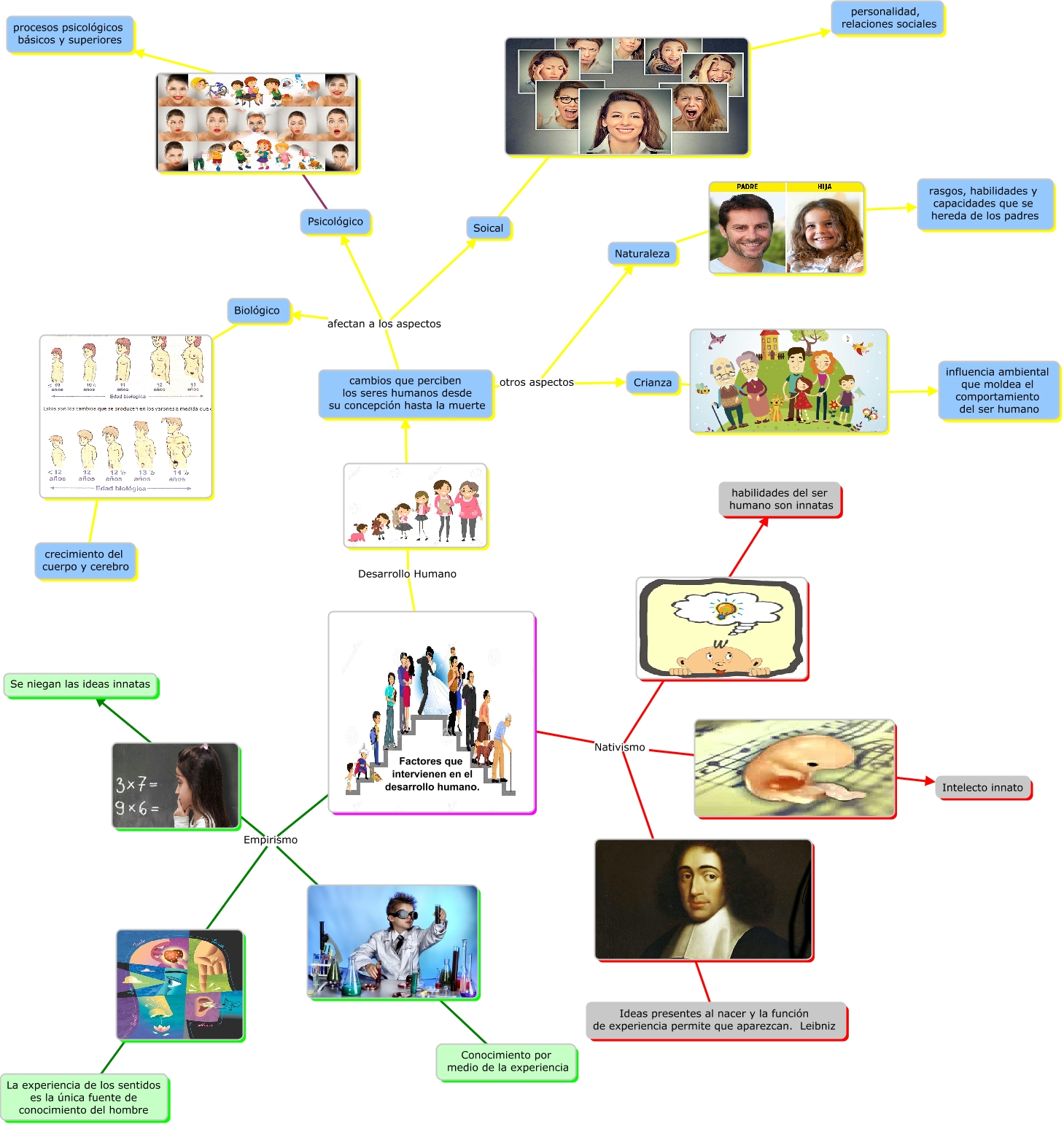Este Cmap, tiene información relacionada con: Desarrollo humano, Factores que intervienen en el desarrollo humano. Nativismo habilidades del ser humano son innatas, cambios que perciben los seres humanos desde su concepción hasta la muerte afectan a los aspectos Biológico, cambios que perciben los seres humanos desde su concepción hasta la muerte afectan a los aspectos Soical, Factores que intervienen en el desarrollo humano. Empirismo Conocimiento por medio de la experiencia, Factores que intervienen en el desarrollo humano. Nativismo Ideas presentes al nacer y la función de experiencia permite que aparezcan. Leibniz, Factores que intervienen en el desarrollo humano. Empirismo Se niegan las ideas innatas, cambios que perciben los seres humanos desde su concepción hasta la muerte otros aspectos Naturaleza, Factores que intervienen en el desarrollo humano. Nativismo Intelecto innato, Crianza influencia ambiental que moldea el comportamiento del ser humano, Psicológico ???? procesos psicológicos básicos y superiores, Naturaleza vvv rasgos, habilidades y capacidades que se hereda de los padres, Factores que intervienen en el desarrollo humano. Desarrollo Humano cambios que perciben los seres humanos desde su concepción hasta la muerte, Soical personalidad, relaciones sociales, cambios que perciben los seres humanos desde su concepción hasta la muerte otros aspectos Crianza, Biológico ???? crecimiento del cuerpo y cerebro, Factores que intervienen en el desarrollo humano. Empirismo La experiencia de los sentidos es la única fuente de conocimiento del hombre, cambios que perciben los seres humanos desde su concepción hasta la muerte afectan a los aspectos Psicológico