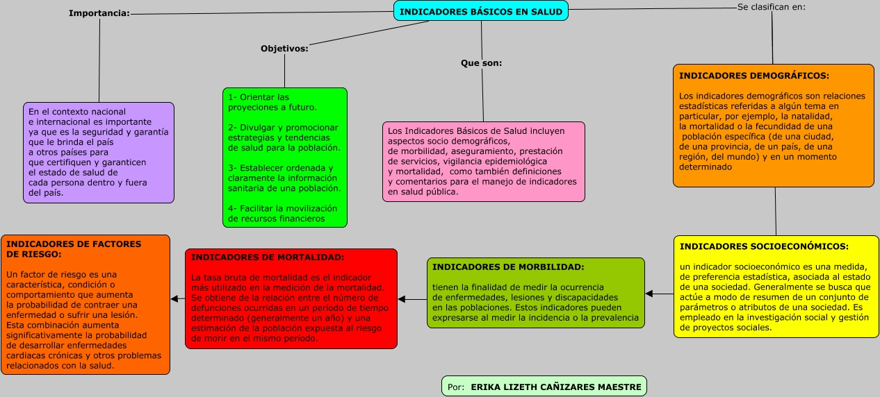 Este Cmap, tiene información relacionada con: INDICADORES BÁSICOS EN SALUD, INDICADORES BÁSICOS EN SALUD Se clasifican en: INDICADORES DEMOGRÁFICOS: Los indicadores demográficos son relaciones estadísticas referidas a algún tema en particular, por ejemplo, la natalidad, la mortalidad o la fecundidad de una población específica (de una ciudad, de una provincia, de un país, de una región, del mundo) y en un momento determinado, INDICADORES BÁSICOS EN SALUD Importancia: En el contexto nacional e internacional es importante ya que es la seguridad y garantía que le brinda el país a otros países para que certifiquen y garanticen el estado de salud de cada persona dentro y fuera del país., INDICADORES SOCIOECONÓMICOS: un indicador socioeconómico es una medida, de preferencia estadística, asociada al estado de una sociedad. Generalmente se busca que actúe a modo de resumen de un conjunto de parámetros o atributos de una sociedad. Es empleado en la investigación social y gestión de proyectos sociales. ???? INDICADORES DE MORBILIDAD: tienen la finalidad de medir la ocurrencia de enfermedades, lesiones y discapacidades en las poblaciones. Estos indicadores pueden expresarse al medir la incidencia o la prevalencia, INDICADORES DE MORBILIDAD: tienen la finalidad de medir la ocurrencia de enfermedades, lesiones y discapacidades en las poblaciones. Estos indicadores pueden expresarse al medir la incidencia o la prevalencia ???? INDICADORES DE MORTALIDAD: La tasa bruta de mortalidad es el indicador más utilizado en la medición de la mortalidad. Se obtiene de la relación entre el número de defunciones ocurridas en un período de tiempo determinado (generalmente un año) y una estimación de la población expuesta al riesgo de morir en el mismo período., INDICADORES BÁSICOS EN SALUD Objetivos: 1- Orientar las proyeciones a futuro. 2- Divulgar y promocionar estrategias y tendencias de salud para la población. 3- Establecer ordenada y claramente la información sanitaria de una población. 4- Facilitar la movilización de recursos financieros, INDICADORES BÁSICOS EN SALUD Se clasifican en: INDICADORES SOCIOECONÓMICOS: un indicador socioeconómico es una medida, de preferencia estadística, asociada al estado de una sociedad. Generalmente se busca que actúe a modo de resumen de un conjunto de parámetros o atributos de una sociedad. Es empleado en la investigación social y gestión de proyectos sociales., INDICADORES BÁSICOS EN SALUD Que son: Los Indicadores Básicos de Salud incluyen aspectos socio demográficos, de morbilidad, aseguramiento, prestación de servicios, vigilancia epidemiológica y mortalidad, como también definiciones y comentarios para el manejo de indicadores en salud pública., INDICADORES DE MORTALIDAD: La tasa bruta de mortalidad es el indicador más utilizado en la medición de la mortalidad. Se obtiene de la relación entre el número de defunciones ocurridas en un período de tiempo determinado (generalmente un año) y una estimación de la población expuesta al riesgo de morir en el mismo período. ???? INDICADORES DE FACTORES DE RIESGO: Un factor de riesgo es una característica, condición o comportamiento que aumenta la probabilidad de contraer una enfermedad o sufrir una lesión. Esta combinación aumenta significativamente la probabilidad de desarrollar enfermedades cardiacas crónicas y otros problemas relacionados con la salud.