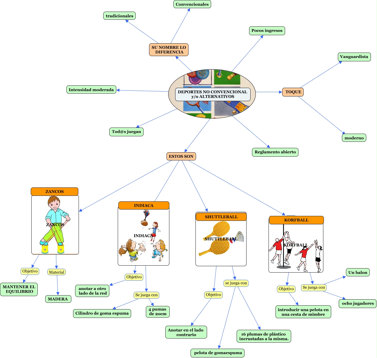 Este Cmap, tiene información relacionada con: 11°4 ALVAREZ HENAO ANGELLY- DEPORTES NO CONVENCIONAL Y ALTERNATIVOS, KORFBALL Se juega con ocho jugadores, TOQUE ???? moderno, ESTOS SON ???? KORFBALL, SU NOMBRE LO DIFERENCIA ???? tradicionales, SHUTTLEBALL se juega con 16 plumas de plástico incrustadas a la misma., DEPORTES NO CONVENCIONAL y/o ALTERNATIVOS ???? Intensidad moderada, ZANCOS Material MADERA, SHUTTLEBALL se juega con pelota de gomaespuma, ESTOS SON ???? SHUTTLEBALL, DEPORTES NO CONVENCIONAL y/o ALTERNATIVOS ???? Reglamento abierto, ZANCOS Objetivo MANTENER EL EQUILIBRIO, ESTOS SON ???? ZANCOS, INDIACA Objetivo anotar a otro lado de la red, TOQUE ???? Vanguardista, KORFBALL Objetivo introducir una pelota en una cesta de mimbre, DEPORTES NO CONVENCIONAL y/o ALTERNATIVOS ???? SU NOMBRE LO DIFERENCIA, ESTOS SON ???? INDIACA, DEPORTES NO CONVENCIONAL y/o ALTERNATIVOS ???? Tod@s juegan, KORFBALL Se juega con Un balon, DEPORTES NO CONVENCIONAL y/o ALTERNATIVOS ???? TOQUE