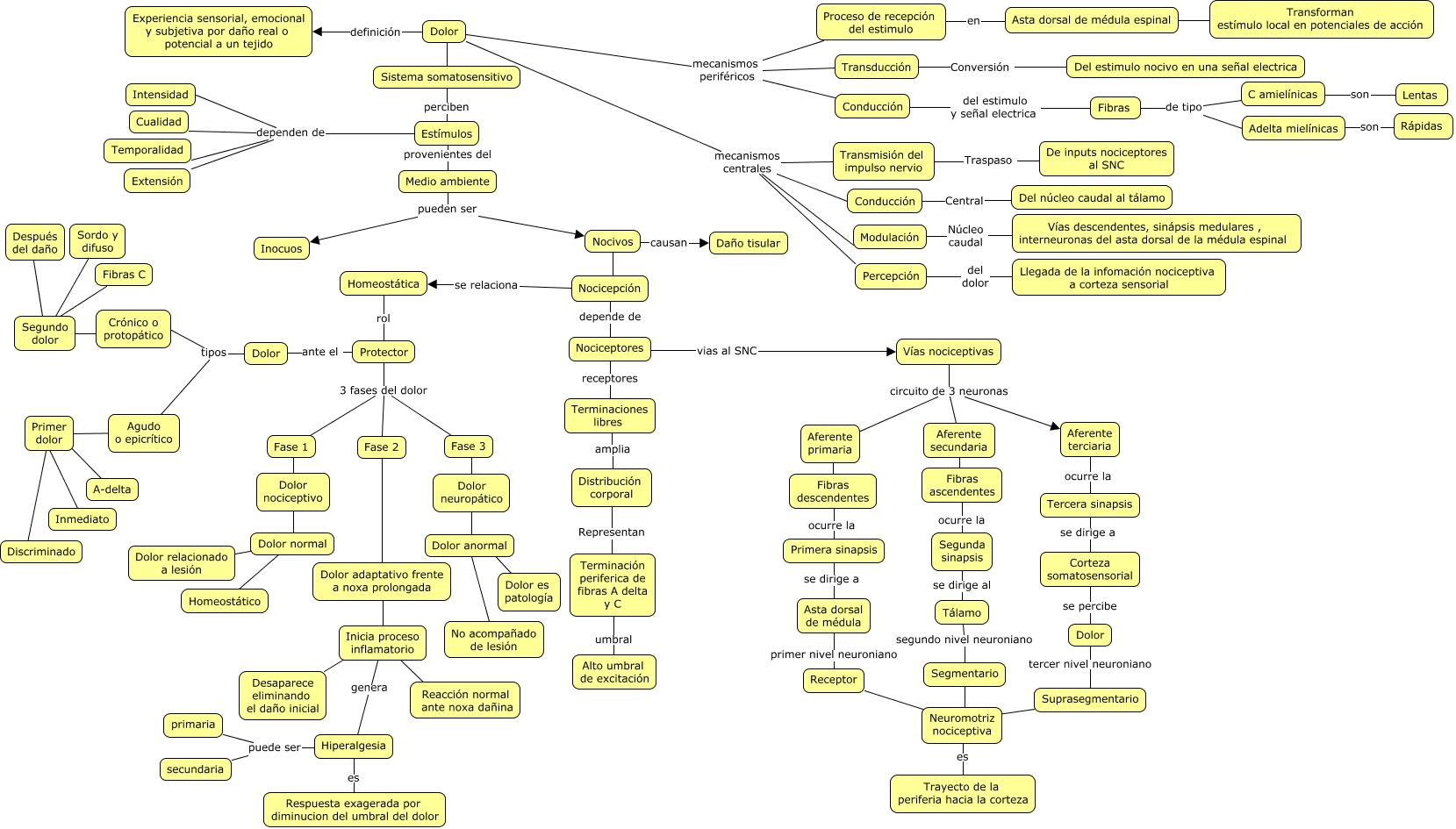 Este Cmap, tiene información relacionada con: DOLOR, Estímulos dependen de Intensidad, Dolor definición Experiencia sensorial, emocional y subjetiva por daño real o potencial a un tejido, Sistema somatosensitivo perciben Estímulos, Fibras de tipo Adelta mielínicas, Dolor normal ???? Dolor relacionado a lesión, Inicia proceso inflamatorio ???? Desaparece eliminando el daño inicial, Percepción del dolor Llegada de la infomación nociceptiva a corteza sensorial, Agudo o epicrítico ???? Primer dolor, Aferente primaria f Fibras descendentes, Medio ambiente pueden ser Nocivos, Dolor mecanismos centrales Percepción, Nocivos causan Daño tisular, C amielínicas son Lentas, Inicia proceso inflamatorio genera Hiperalgesia, Primer dolor ???? Inmediato, Transmisión del impulso nervio Traspaso De inputs nociceptores al SNC, Homeostática rol Protector, Aferente secundaria ???? Fibras ascendentes, Dolor adaptativo frente a noxa prolongada ???? Inicia proceso inflamatorio, Dolor nociceptivo ???? Dolor normal