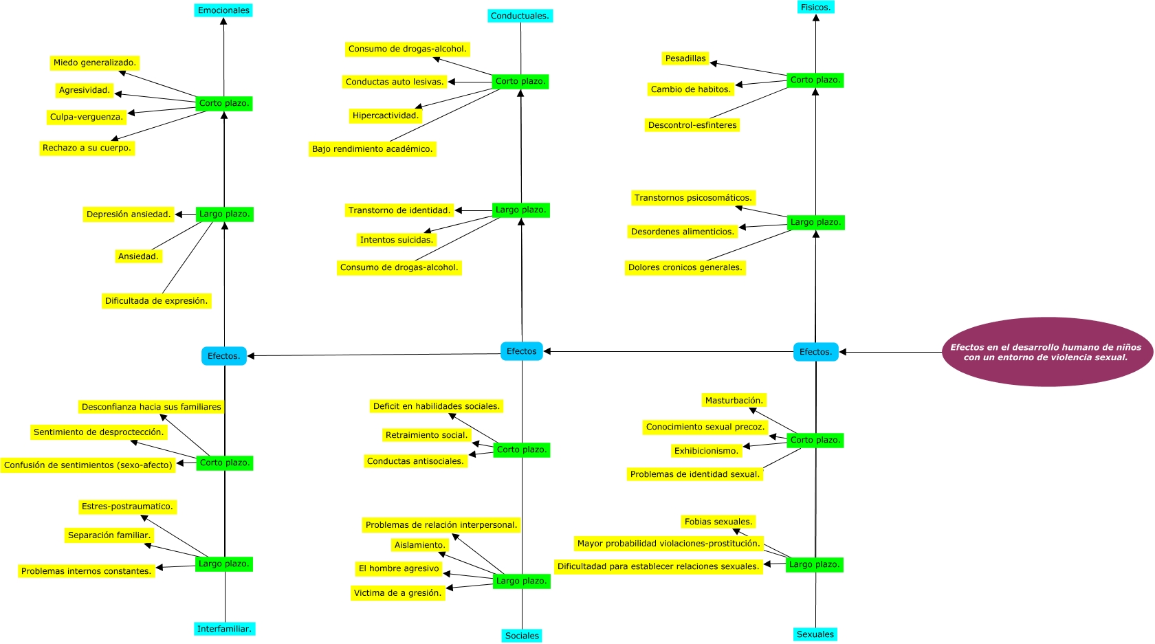 Este Cmap, tiene información relacionada con: Violencia sexual, Largo plazo. ???? El hombre agresivo, Corto plazo. ???? Conocimiento sexual precoz., Corto plazo. ???? Miedo generalizado., Largo plazo. ???? Ansiedad., Efectos. ???? Emocionales, Largo plazo. ???? Dolores cronicos generales., Largo plazo. ???? Transtornos psicosomáticos., Corto plazo. ???? Problemas de identidad sexual., Largo plazo. ???? Dificultada de expresión., Efectos. ???? Sexuales, Largo plazo. Pr Problemas de relación interpersonal., Efectos. ???? Efectos, Efectos. ???? Corto plazo., Largo plazo. ???? Victima de a gresión., Corto plazo. ???? Consumo de drogas-alcohol., Largo plazo. ???? Intentos suicidas., Efectos ???? Corto plazo., Efectos en el desarrollo humano de niños con un entorno de violencia sexual. ???? Efectos., Corto plazo. ???? Desconfianza hacia sus familiares, Corto plazo. ???? Hipercactividad.