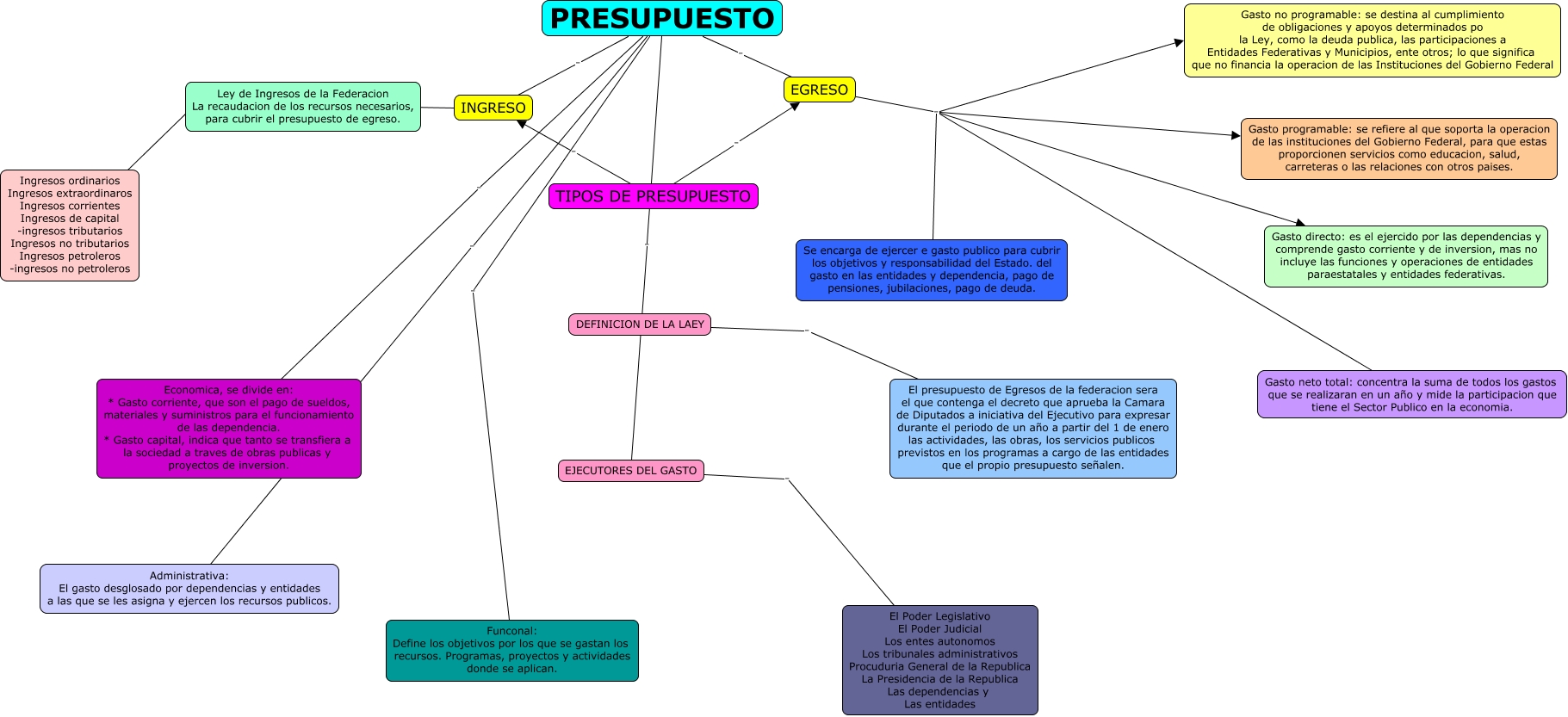 Este Cmap, tiene información relacionada con: tipos de presupuestos, EGRESO . Gasto no programable: se destina al cumplimiento de obligaciones y apoyos determinados po la Ley, como la deuda publica, las participaciones a Entidades Federativas y Municipios, ente otros; lo que significa que no financia la operacion de las Instituciones del Gobierno Federal, EJECUTORES DEL GASTO . El Poder Legislativo El Poder Judicial Los entes autonomos Los tribunales administrativos Procuduria General de la Republica La Presidencia de la Republica Las dependencias y Las entidades, EGRESO . Gasto programable: se refiere al que soporta la operacion de las instituciones del Gobierno Federal, para que estas proporcionen servicios como educacion, salud, carreteras o las relaciones con otros paises., PRESUPUESTO . INGRESO, Ley de Ingresos de la Federacion La recaudacion de los recursos necesarios, para cubrir el presupuesto de egreso. Ingresos ordinarios Ingresos extraordinaros Ingresos corrientes Ingresos de capital -ingresos tributarios Ingresos no tributarios Ingresos petroleros -ingresos no petroleros, INGRESO ???? Ley de Ingresos de la Federacion La recaudacion de los recursos necesarios, para cubrir el presupuesto de egreso., TIPOS DE PRESUPUESTO . EGRESO, PRESUPUESTO . Funconal: Define los objetivos por los que se gastan los recursos. Programas, proyectos y actividades donde se aplican., EGRESO . Gasto neto total: concentra la suma de todos los gastos que se realizaran en un año y mide la participacion que tiene el Sector Publico en la economia., EGRESO . Se encarga de ejercer e gasto publico para cubrir los objetivos y responsabilidad del Estado. del gasto en las entidades y dependencia, pago de pensiones, jubilaciones, pago de deuda., TIPOS DE PRESUPUESTO . INGRESO, PRESUPUESTO . EGRESO, DEFINICION DE LA LAEY . El presupuesto de Egresos de la federacion sera el que contenga el decreto que aprueba la Camara de Diputados a iniciativa del Ejecutivo para expresar durante el periodo de un año a partir del 1 de enero las actividades, las obras, los servicios publicos previstos en los programas a cargo de las entidades que el propio presupuesto señalen., PRESUPUESTO . EJECUTORES DEL GASTO, EGRESO . Gasto directo: es el ejercido por las dependencias y comprende gasto corriente y de inversion, mas no incluye las funciones y operaciones de entidades paraestatales y entidades federativas., PRESUPUESTO . Administrativa: El gasto desglosado por dependencias y entidades a las que se les asigna y ejercen los recursos publicos., PRESUPUESTO . Economica, se divide en: * Gasto corriente, que son el pago de sueldos, materiales y suministros para el funcionamiento de las dependencia. * Gasto capital, indica que tanto se transfiera a la sociedad a traves de obras publicas y proyectos de inversion.
