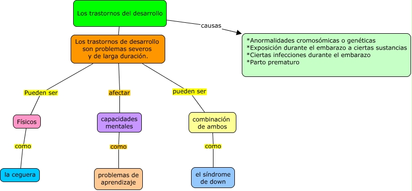 Este Cmap, tiene información relacionada con: Psicologia.deber2, Los trastornos del desarrollo causas *Anormalidades cromosómicas o genéticas *Exposición durante el embarazo a ciertas sustancias *Ciertas infecciones durante el embarazo *Parto prematuro, capacidades mentales como problemas de aprendizaje, Los trastornos de desarrollo son problemas severos y de larga duración. pueden ser combinación de ambos, Físicos como la ceguera, combinación de ambos como el síndrome de down, Los trastornos de desarrollo son problemas severos y de larga duración. afectar capacidades mentales, Los trastornos de desarrollo son problemas severos y de larga duración. Pueden ser Físicos, Los trastornos del desarrollo ???? Los trastornos de desarrollo son problemas severos y de larga duración.