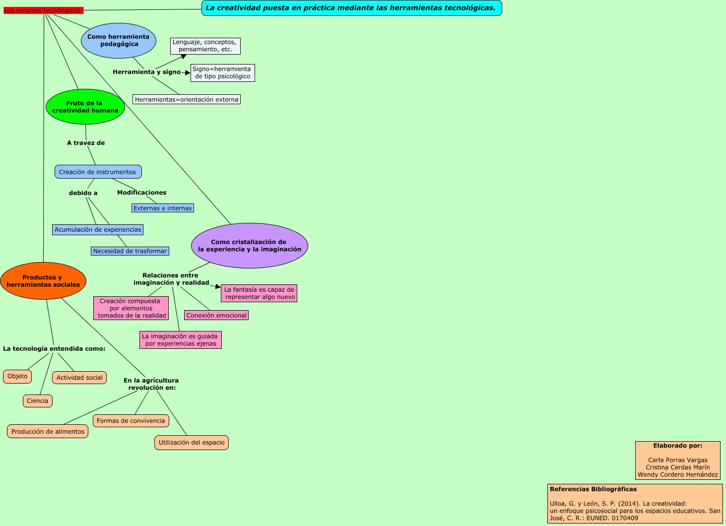 Este Cmap, tiene información relacionada con: Mapa creatividad, La creatividad puesta en práctica mediante las herramientas tecnológicas. Los recursos tecnológicos: Como herramienta pedagógica, Como cristalización de la experiencia y la imaginación Relaciones entre imaginación y realidad La imaginación es guiada por experiencias ejenas, Como herramienta pedagógica Herramienta y signo Lenguaje, conceptos, pensamiento, etc., Como herramienta pedagógica Herramienta y signo Herramientas=orientación externa, La creatividad puesta en práctica mediante las herramientas tecnológicas. Los recursos tecnológicos: Productos y herramientas sociales, Productos y herramientas sociales La tecnología entendida como: Actividad social, Fruto de la creatividad humana A travez de Creación de instrumentos, Creación de instrumentos debido a Necesidad de trasformar, Productos y herramientas sociales En la agrícultura revolución en: Producción de alimentos, Como herramienta pedagógica Herramienta y signo Signo=herramienta de tipo psicológico, Como cristalización de la experiencia y la imaginación Relaciones entre imaginación y realidad Creación compuesta por elementos tomados de la realidad, La creatividad puesta en práctica mediante las herramientas tecnológicas. Los recursos tecnológicos: Como cristalización de la experiencia y la imaginación, Productos y herramientas sociales La tecnología entendida como: Objeto, Productos y herramientas sociales En la agrícultura revolución en: Formas de convivencia, Como cristalización de la experiencia y la imaginación Relaciones entre imaginación y realidad La fantasía es capaz de representar algo nuevo, Creación de instrumentos Modificaciones Externas e internas, Creación de instrumentos debido a Acumulación de experiencias, Productos y herramientas sociales La tecnología entendida como: Ciencia, Productos y herramientas sociales En la agrícultura revolución en: Utilización del espacio, La creatividad puesta en práctica mediante las herramientas tecnológicas. Los recursos tecnológicos: Fruto de la creatividad humana