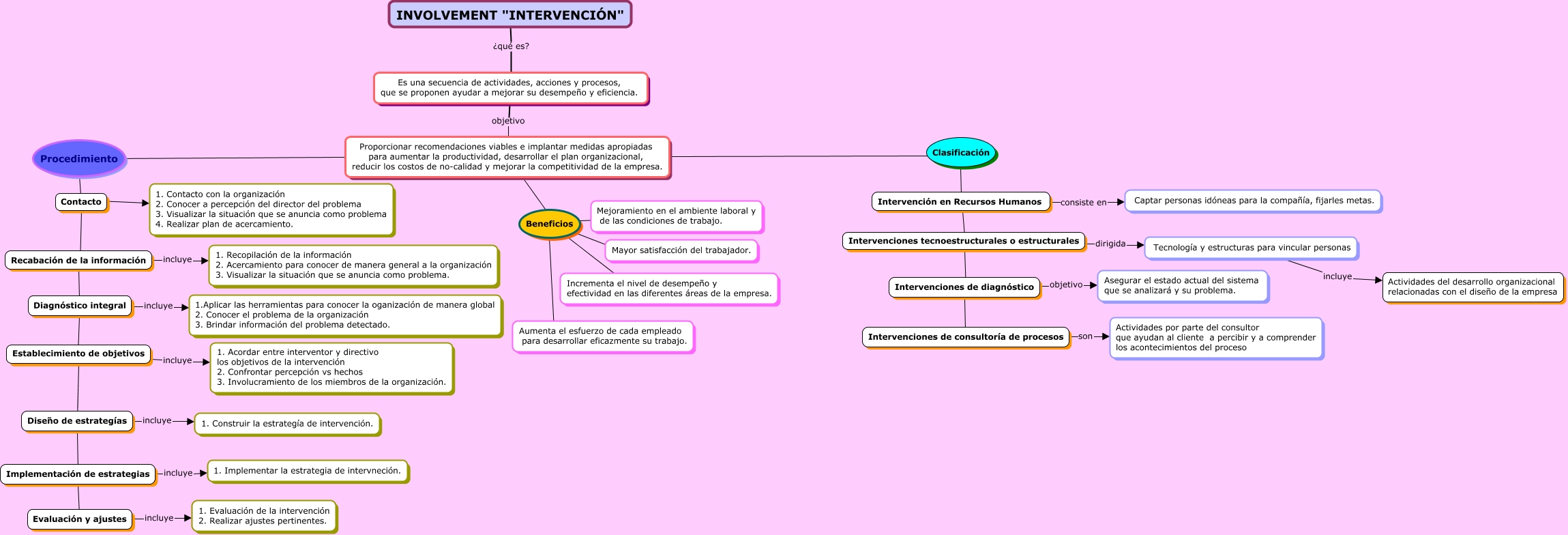 Este Cmap, tiene información relacionada con: INVOLVEMENT, Proporcionar recomendaciones viables e implantar medidas apropiadas para aumentar la productividad, desarrollar el plan organizacional, reducir los costos de no-calidad y mejorar la competitividad de la empresa. ???? Procedimiento, Establecimiento de objetivos incluye 1. Acordar entre interventor y directivo los objetivos de la intervención 2. Confrontar percepción vs hechos 3. Involucramiento de los miembros de la organización., Diseño de estrategías incluye 1. Construir la estrategía de intervención., Beneficios ???? Incrementa el nivel de desempeño y efectividad en las diferentes áreas de la empresa., Intervenciones de diagnóstico ???? Intervenciones de consultoría de procesos, Procedimiento incluye Contacto, Clasificación ???? Intervención en Recursos Humanos, Intervención en Recursos Humanos ???? Intervenciones tecnoestructurales o estructurales, Es una secuencia de actividades, acciones y procesos, que se proponen ayudar a mejorar su desempeño y eficiencia. objetivo Proporcionar recomendaciones viables e implantar medidas apropiadas para aumentar la productividad, desarrollar el plan organizacional, reducir los costos de no-calidad y mejorar la competitividad de la empresa., Evaluación y ajustes incluye 1. Evaluación de la intervención 2. Realizar ajustes pertinentes., Implementación de estrategias ???? Evaluación y ajustes, INVOLVEMENT "INTERVENCIÓN" ¿qué es? Es una secuencia de actividades, acciones y procesos, que se proponen ayudar a mejorar su desempeño y eficiencia., Beneficios ???? Mejoramiento en el ambiente laboral y de las condiciones de trabajo., Diseño de estrategías ???? Implementación de estrategias, Recabación de la información ???? Diagnóstico integral, Intervenciones de diagnóstico objetivo Asegurar el estado actual del sistema que se analizará y su problema., Proporcionar recomendaciones viables e implantar medidas apropiadas para aumentar la productividad, desarrollar el plan organizacional, reducir los costos de no-calidad y mejorar la competitividad de la empresa. ???? Beneficios, Diagnóstico integral ???? Establecimiento de objetivos, Establecimiento de objetivos ???? Diseño de estrategías, Diagnóstico integral incluye 1.Aplicar las herramientas para conocer la oganización de manera global 2. Conocer el problema de la organización 3. Brindar información del problema detectado.