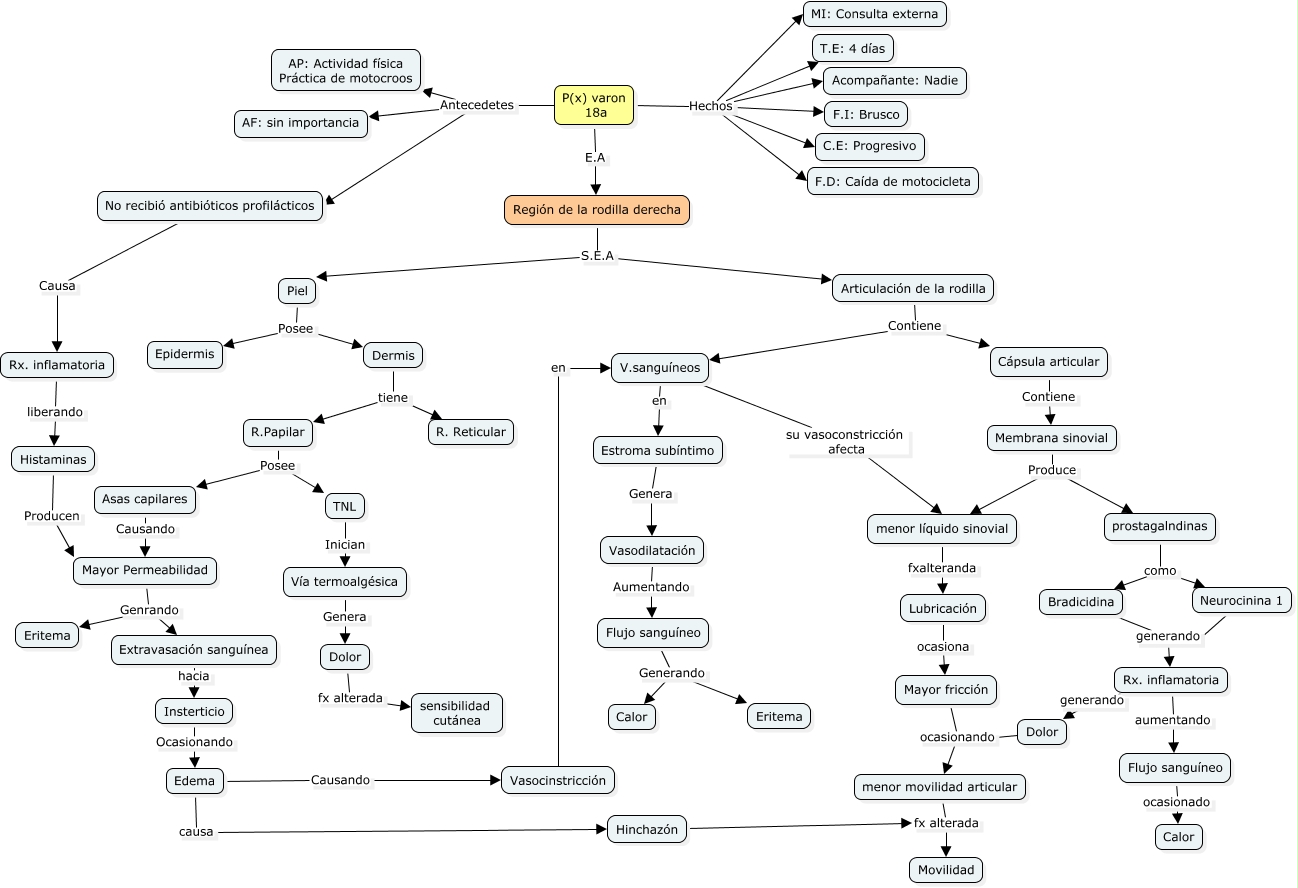 Este Cmap, tiene información relacionada con: MP ABP SEMANA 2 - ARTICULACIONES, Piel Posee Epidermis, Vasocinstricción en V.sanguíneos, Extravasación sanguínea hacia Insterticio, Piel Posee Dermis, Membrana sinovial Produce prostagalndinas, prostagalndinas como Bradicidina, Cápsula articular Contiene Membrana sinovial, Vasodilatación Aumentando Flujo sanguíneo, Rx. inflamatoria generando Dolor, Flujo sanguíneo Generando Calor, P(x) varon 18a Antecedetes No recibió antibióticos profilácticos, Dolor ocasionando menor movilidad articular, Rx. inflamatoria aumentando Flujo sanguíneo, Mayor fricción ocasionando menor movilidad articular, Bradicidina generando Rx. inflamatoria, P(x) varon 18a E.A Región de la rodilla derecha, Dermis tiene R.Papilar, Membrana sinovial Produce menor líquido sinovial, P(x) varon 18a Antecedetes AF: sin importancia, P(x) varon 18a Antecedetes AP: Actividad física Práctica de motocroos