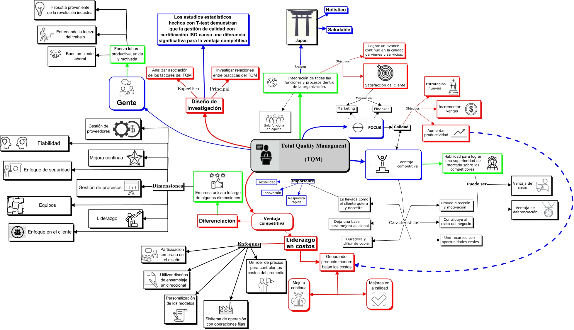 Este Cmap, tiene información relacionada con: TQM, Ventaja competitiva Características Une recursos con oportunidades reales, Total Quality Managment (TQM) Diseño de investigación, Liderazgo en costos Generando producto maduro bajan los costos, Japón Saludable, Habilidad para lograr una superioridad de mercado sobre los competidores. Puede ser Ventaja de diferenciación, Empresa única a lo largo de algunas dimensiones Dimensiones Enfoque en el cliente, Generando producto maduro bajan los costos Mejora continua, Es llevada como el cliente quiera y necesite Importante Respuesta rápida, Total Quality Managment (TQM) Ventaja competitiva, Liderazgo en costos Enfoques Utilizar diseños de ensamblaje unidireccional, Diseño de investigación Principal Investigar relaciones entre practicas del TQM, Empresa única a lo largo de algunas dimensiones Dimensiones Equipos, Mejora continua Mejoras en la calidad, Liderazgo en costos Enfoques Sisitema de operación con operaciones fijas, Total Quality Managment (TQM) Gente, Ventaja competitiva Habilidad para lograr una superioridad de mercado sobre los competidores., Ventaja competitiva Características Provee dirección y motivación, Satisfacción del cliente Mejorar en Marketing, Satisfacción del cliente Mejorar en Finanzas, Total Quality Managment (TQM) FOCUS Marketing
