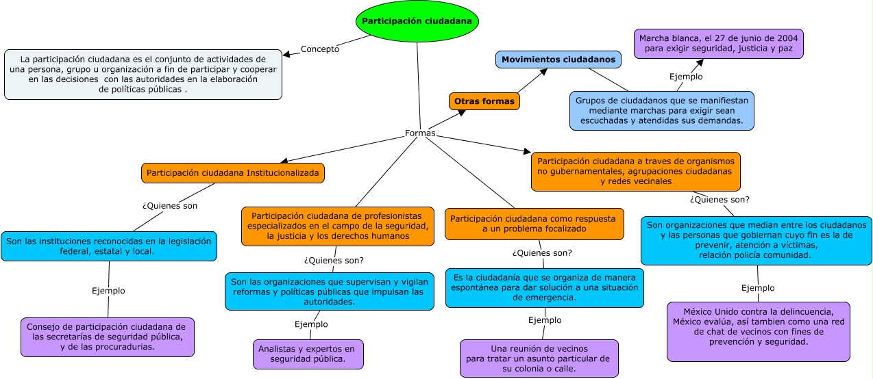 Este Cmap, tiene información relacionada con: SPPC_U2_A1_GAGE, Participación ciudadana Formas Participación ciudadana como respuesta a un problema focalizado, Participación ciudadana Formas Participación ciudadana de profesionistas especializados en el campo de la seguridad, la justicia y los derechos humanos, Son las instituciones reconocidas en la legislación federal, estatal y local. Ejemplo Consejo de participación ciudadana de las secretarías de seguridad pública, y de las procuradurias., Son organizaciones que median entre los ciudadanos y las personas que gobiernan cuyo fin es la de prevenir, atención a víctimas, relación policía comunidad. Ejemplo México Unido contra la delincuencia, México evalúa, así tambien como una red de chat de vecinos con fines de prevención y seguridad., Movimientos ciudadanos ???? Grupos de ciudadanos que se manifiestan mediante marchas para exigir sean escuchadas y atendidas sus demandas., Grupos de ciudadanos que se manifiestan mediante marchas para exigir sean escuchadas y atendidas sus demandas. Ejemplo Marcha blanca, el 27 de junio de 2004 para exigir seguridad, justicia y paz, Participación ciudadana Institucionalizada ¿Quienes son Son las instituciones reconocidas en la legislación federal, estatal y local., Es la ciudadanía que se organiza de manera espontánea para dar solución a una situación de emergencia. Ejemplo Una reunión de vecinos para tratar un asunto particular de su colonia o calle., Participación ciudadana Concepto La participación ciudadana es el conjunto de actividades de una persona, grupo u organización a fin de participar y cooperar en las decisiones con las autoridades en la elaboración de políticas públicas ., Son las organizaciones que supervisan y vigilan reformas y políticas públicas que impulsan las autoridades. Ejemplo Analistas y expertos en seguridad pública., Participación ciudadana de profesionistas especializados en el campo de la seguridad, la justicia y los derechos humanos ¿Quienes son? Son las organizaciones que supervisan y vigilan reformas y políticas públicas que impulsan las autoridades., Otras formas ???? Movimientos ciudadanos, Participación ciudadana Formas Otras formas, Participación ciudadana Formas Participación ciudadana a traves de organismos no gubernamentales, agrupaciones ciudadanas y redes vecinales, Participación ciudadana a traves de organismos no gubernamentales, agrupaciones ciudadanas y redes vecinales ¿Quienes son? Son organizaciones que median entre los ciudadanos y las personas que gobiernan cuyo fin es la de prevenir, atención a víctimas, relación policía comunidad., Participación ciudadana como respuesta a un problema focalizado ¿Quienes son? Es la ciudadanía que se organiza de manera espontánea para dar solución a una situación de emergencia., Participación ciudadana Formas Participación ciudadana Institucionalizada