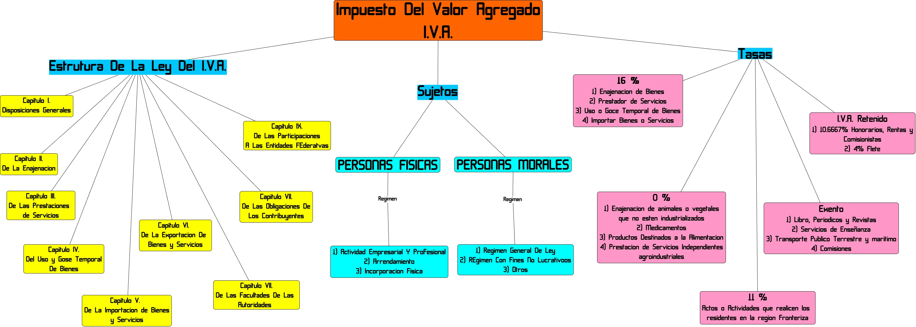 Este Cmap, tiene información relacionada con: IVA, PERSONAS MORALES Regimen 1) Regimen General De Ley 2) REgimen Con Fines No Lucrativoos 3) Otros, PERSONAS FISICAS Regimen 1) Actividad Empresarial Y Profesional 2) Arrendamiento 3) Incorporacion Fisica, Impuesto Del Valor Agregado I.V.A. Tasas 11 % Actos o Actividades que realicen los residentes en la region fronteriza, Impuesto Del Valor Agregado I.V.A. Sujetos PERSONAS FISICAS, Impuesto Del Valor Agregado I.V.A. Estrutura De La Ley Del I.V.A. Capitulo V. De La Importacion de Bienes y Servicios, Impuesto Del Valor Agregado I.V.A. Estrutura De La Ley Del I.V.A. Capitulo IX. De Las Participaciones A Las Entidades FEderatvas, Impuesto Del Valor Agregado I.V.A. Estrutura De La Ley Del I.V.A. Capitulo VII. De Las Facultades De Las Autoridades, Impuesto Del Valor Agregado I.V.A. Estrutura De La Ley Del I.V.A. Capitulo VII. De Las Obligaciones De Los Contribuyentes, Impuesto Del Valor Agregado I.V.A. Tasas 0 % 1) Enajenacion de animales o vegetales que no esten industrializados 2) Medicamentos 3) Productos Destinados a la Alimentacion 4) Prestacion de Servicios Independientes agroindustriales, Impuesto Del Valor Agregado I.V.A. Tasas 16 % 1) Enajenacion de Bienes 2) Prestador de Servicios 3) Uso o Goce Temporal de Bienes 4) Importar Bienes o Servicios, Impuesto Del Valor Agregado I.V.A. Estrutura De La Ley Del I.V.A. Capitulo I. Disposiciones Generales, Impuesto Del Valor Agregado I.V.A. Estrutura De La Ley Del I.V.A. Capitulo III. De Las Prestaciones de Servicios, Impuesto Del Valor Agregado I.V.A. Estrutura De La Ley Del I.V.A. Capitulo IV. Del Uso y Gose Temporal De Bienes, Impuesto Del Valor Agregado I.V.A. Estrutura De La Ley Del I.V.A. Capitulo II. De La Enajenacion, Impuesto Del Valor Agregado I.V.A. Tasas Exento 1) Libro, Periodicos y Revistas 2) Servicios de Enseñanza 3) Transporte Publico Terrestre y maritimo 4) Comisiones, Impuesto Del Valor Agregado I.V.A. Estrutura De La Ley Del I.V.A. Capitulo VI. De La Exportacion De Bienes y Servicios, Impuesto Del Valor Agregado I.V.A. Sujetos PERSONAS MORALES, Impuesto Del Valor Agregado I.V.A. Tasas I.V.A. Retenido 1) 10.6667% Honorarios, Rentas y Comisionistas 2) 4% Flete