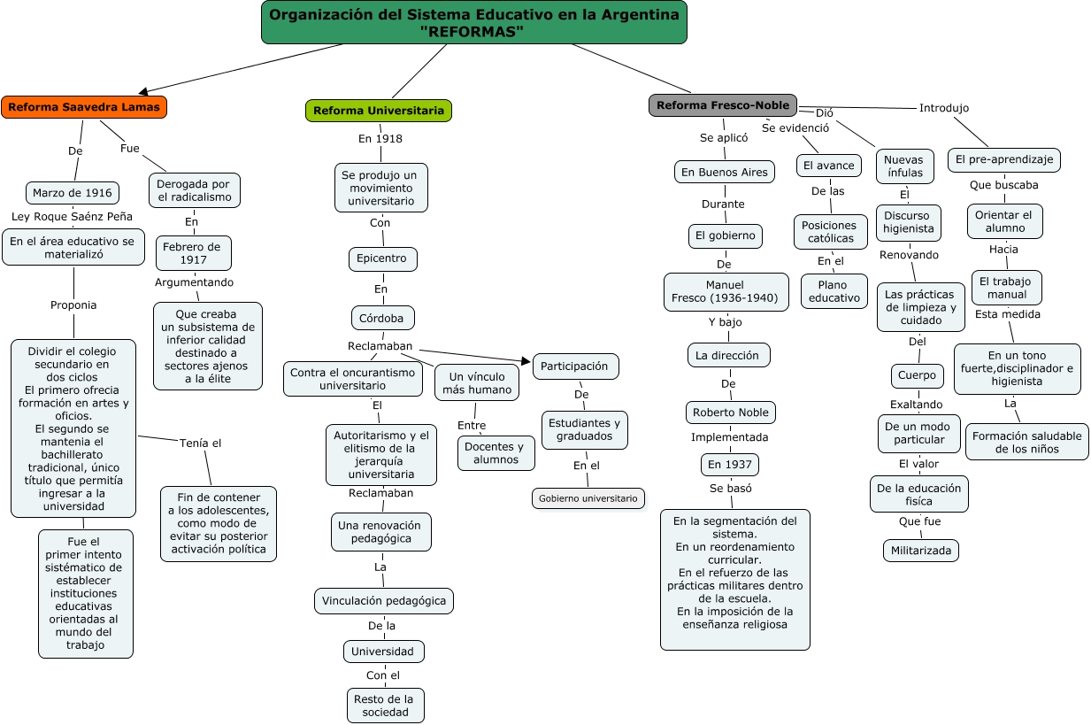Este Cmap, tiene información relacionada con: Reformas, Febrero de 1917 Argumentando Que creaba un subsistema de inferior calidad destinado a sectores ajenos a la élite, Universidad Con el Resto de la sociedad, Reforma Fresco-Noble Introdujo El pre-aprendizaje, Participación De Estudiantes y graduados, Se produjo un movimiento universitario Con Epicentro, Córdoba Reclamaban Un vínculo más humano, Organización del Sistema Educativo en la Argentina "REFORMAS" ???? Reforma Saavedra Lamas, Un vínculo más humano Entre Docentes y alumnos, En un tono fuerte,disciplinador e higienista La Formación saludable de los niños, Reforma Universitaria En 1918 Se produjo un movimiento universitario, Orientar el alumno Hacia El trabajo manual, La dirección De Roberto Noble, Córdoba Reclamaban Contra el oncurantismo universitario, Dividir el colegio secundario en dos ciclos El primero ofrecia formación en artes y oficios. El segundo se mantenia el bachillerato tradicional, único título que permitía ingresar a la universidad Tenía el Fin de contener a los adolescentes, como modo de evitar su posterior activación política, Reforma Saavedra Lamas De Marzo de 1916, Una renovación pedagógica La Vinculación pedagógica, Contra el oncurantismo universitario El Autoritarismo y el elitismo de la jerarquía universitaria, Organización del Sistema Educativo en la Argentina "REFORMAS" ???? Reforma Universitaria, Vinculación pedagógica De la Universidad, Cuerpo Exaltando De un modo particular