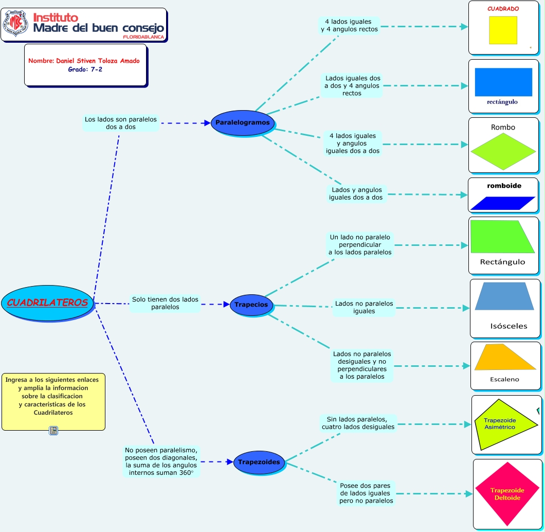 Este Cmap, tiene información relacionada con: DANIEL S. TOLOZA AMADO 7-2 Mapa Conceptual Cuadriláteros, Paralelogramos Lados y angulos iguales dos a dos, CUADRILATEROS Los lados son paralelos dos a dos Paralelogramos, Trapecios Lados no paralelos iguales, Paralelogramos 4 lados iguales y 4 angulos rectos, CUADRILATEROS Solo tienen dos lados paralelos Trapecios, Trapezoides Posee dos pares de lados iguales pero no paralelos Trapezoide Deltoide, Trapecios Un lado no paralelo perpendicular a los lados paralelos, Paralelogramos 4 lados iguales y angulos iguales dos a dos, Paralelogramos Lados iguales dos a dos y 4 angulos rectos, CUADRILATEROS No poseen paralelismo, poseen dos diagonales, la suma de los angulos internos suman 360° Trapezoides, Trapecios Lados no paralelos desiguales y no perpendiculares a los paralelos, Trapezoides Sin lados paralelos, cuatro lados desiguales