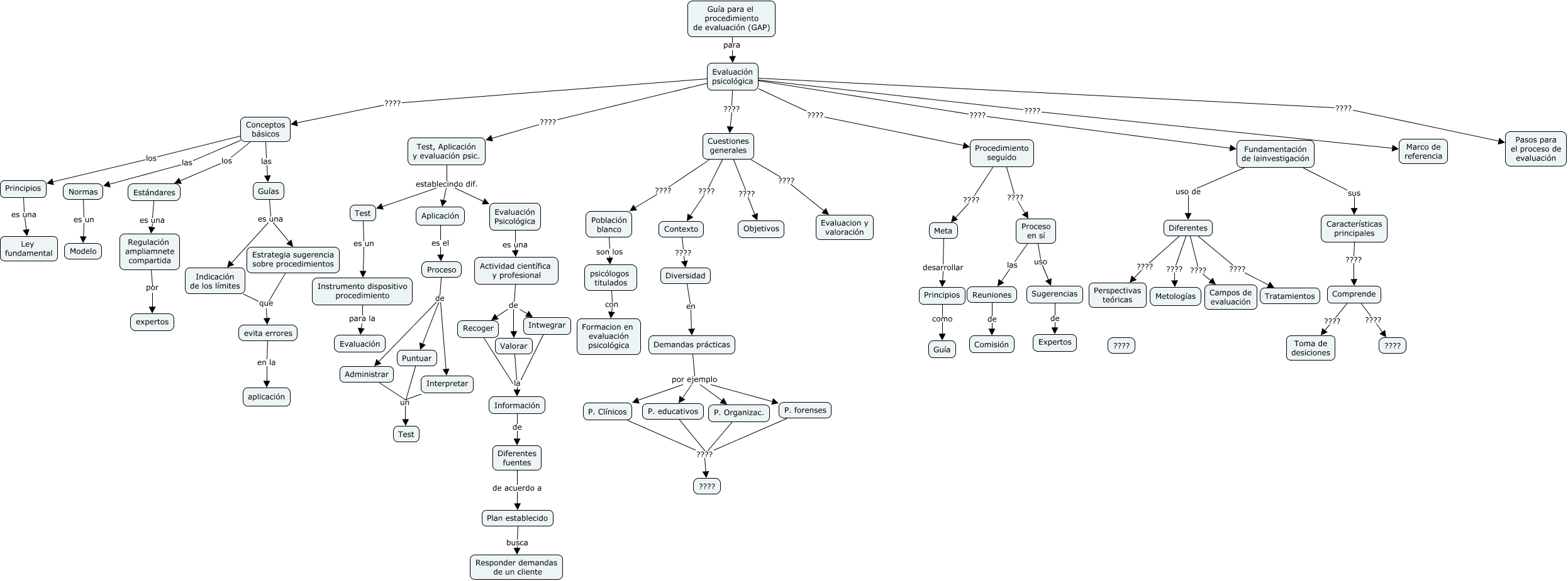 Este Cmap, tiene información relacionada con: 1° Guía para la evaluación de procesos psicológicos, P. educativos ???? ????, Fundamentación de lainvestigación uso de Diferentes, Valorar la Información, Intwegrar la Información, Conceptos básicos las Normas, Actividad científica y profesional de Valorar, Puntuar un Test, Sugerencias de Expertos, Guías es una Estrategia sugerencia sobre procedimientos, Demandas prácticas por ejemplo P. forenses, Actividad científica y profesional de Intwegrar, Proceso de Interpretar, P. Clínicos ???? ????, Aplicación es el Proceso, Guía para el procedimiento de evaluación (GAP) para Evaluación psicológica, Procedimiento seguido ???? Meta, Cuestiones generales ???? Objetivos, Principios es una Ley fundamental, Proceso de Administrar, Contexto ???? Diversidad
