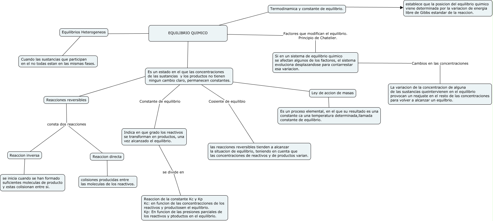 Este Cmap, tiene información relacionada con: mapa, Ley de accion de masas ???? Es un proceso elemental, en el que su resultado es una constante ca una temperatura determinada,llamada constante de equilibrio., Indica en que grado los reactivos se transforman en productos, una vez alcanzado el equilibrio. se divide en Reaccion de la constante Kc y Kp Kc: en funcion de las concentracciones de los reactivos y productosen el equilibrio. Kp: En funcion de las presiones parciales de los reactivos y ptoductos en el equilibrio., EQUILIBRIO QUIMICO ???? Equilibrios Heterogeneos, Termodinamica y constante de equilibrio. ???? establece que la posicion del equilibrio quimico viene determinada por la variacion de energia libre de Gibbs estandar de la reaccion., Reaccion inversa ???? se inicia cuando se han formado suficientes moleculas de producto y estas colisionan entre si., EQUILIBRIO QUIMICO ???? Es un estado en el que las concentraciones de las sustancias y los productos no tienen ningun cambio claro, permanecen constantes., Es un estado en el que las concentraciones de las sustancias y los productos no tienen ningun cambio claro, permanecen constantes. ???? Ley de accion de masas, Reaccion directa ???? colisiones producidas entre las moleculas de los reactivos., Es un estado en el que las concentraciones de las sustancias y los productos no tienen ningun cambio claro, permanecen constantes. Cosiente de equilibio las reacciones reversibles tienden a alcanzar la situacion de equilibrio, teniendo en cuenta que las concentraciones de reactivos y de productos varian., Reacciones reversibles ???? Es un estado en el que las concentraciones de las sustancias y los productos no tienen ningun cambio claro, permanecen constantes., Es un estado en el que las concentraciones de las sustancias y los productos no tienen ningun cambio claro, permanecen constantes. Constante de equilibrio Indica en que grado los reactivos se transforman en productos, una vez alcanzado el equilibrio., EQUILIBRIO QUIMICO ???? Termodinamica y constante de equilibrio., EQUILIBRIO QUIMICO Factores que modifican el equilibrio. Principio de Chatelier. Si en un sistema de equilibrio quimico se afectan algunos de los factores, el sistema evoluciona desplazandose para contarrestar esa variacion., Si en un sistema de equilibrio quimico se afectan algunos de los factores, el sistema evoluciona desplazandose para contarrestar esa variacion. Cambios en las concentraciones La variacion de la concentracion de alguna de las sustancias queintervienen en el equilibrio provocan un reajuste en el resto de las concentraciones para volver a alcanzar un equilbrio., Reacciones reversibles consta dos reacciones Reaccion directa, Equilibrios Heterogeneos ???? Cuando las sustancias que participan en el no todas estan en las mismas fases., Reacciones reversibles consta dos reacciones Reaccion inversa