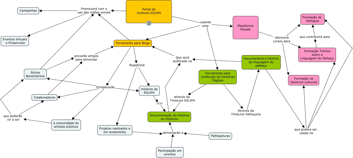 Esse mapa conceitual, produzido no IHMC CmapTools, tem a informação relacionada a: Portal da ESLIPA, a comunidade de artistas públicos que poderão vir a ser Colaboradores, Sócios Beneméritos Promoverá com o uso das mídias sociais Eventos Virtuais e Presenciais, Documentará a história da linguagem do palhaço que podera ser usada na Formação de Palhaços, Ferramenta para Blogs Registrará Projetos realizados e em andamento, Documentará a história da linguagem do palhaço que podera ser usada na Formação Teórica sobre a Linguagem do Palhaço, Plataforma Moodle oferecerá cursos para Formação Teórica sobre a Linguagem do Palhaço, Plataforma Moodle oferecerá cursos para Formação de Gestores culturais, mestres da ESLIPA ???? Documentação da História do Instituto, Palhaçaturas alimentarão a Documentação da História do Instituto, Formação Teórica sobre a Linguagem do Palhaço que contribuirá para Formação de Palhaços, Documentação da História do Instituto Que será publicada na Ferramenta para Blogs, Plataforma Moodle oferecerá cursos para Formação de Palhaços, Ferramenta para Blogs Fortalecerão Sócios Beneméritos, Colaboradores enviarão artigos para alimentar Ferramenta para Blogs, Ferramenta para Blogs Promoverá com o uso das mídias sociais Eventos Virtuais e Presenciais, Portal do Instituto ESLIPA Promoverá com o uso das mídias sociais Campanhas, Ferramenta para Blogs Fortalecerão mestres da ESLIPA, Portal do Instituto ESLIPA usando uma Plataforma Moodle, Ferramenta para confecção de timelines Digitais através da TimeLine ESLIPA Documentação da História do Instituto, Documentará a história da linguagem do palhaço que podera ser usada na Formação de Gestores culturais